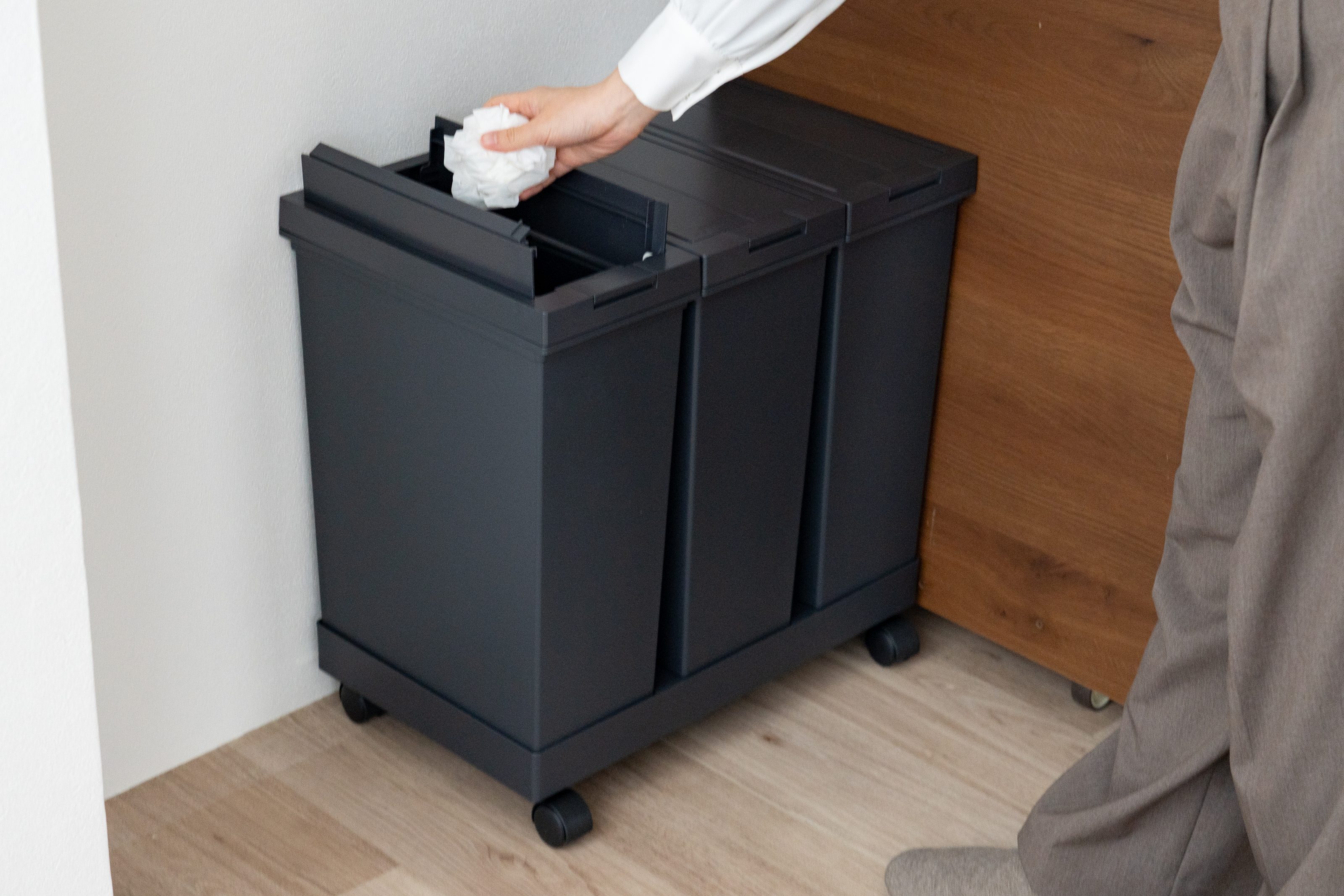 - すき間や壁側:スリムで四角い形状のゴミ箱は、家具の横や壁沿いのわずかなスペースにぴったりフィットし、動線の邪魔になりにくいです。