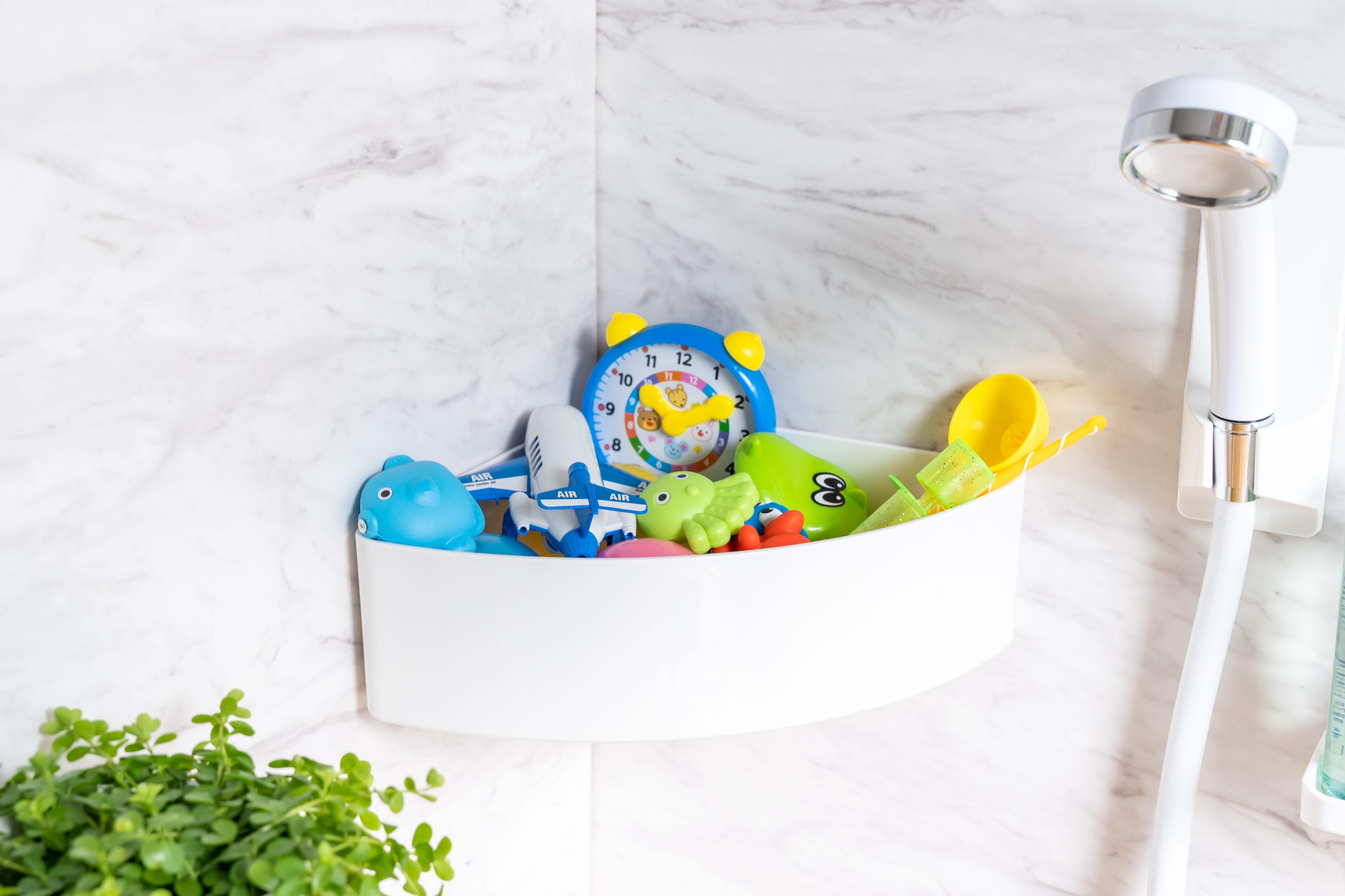 - おもちゃ:子供のお風呂用おもちゃは、底がメッシュになったマグネットバスケットに入れることで、水切れ良く収納できます。子供が自分で片付けられる高さに設置すれば、お片付けの習慣付けにも繋がります。アスベルの「ラックスMGコーナーラック」は大人気です。