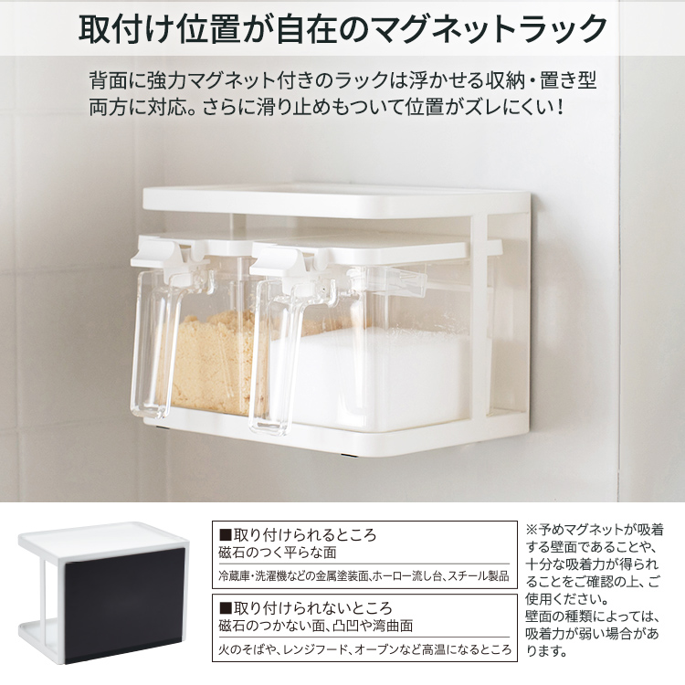 - ラック/フレーム=鉄(樹脂コーティング)・ラバーマグネット、トレー=ポリスチレン、スベリ止め(底部)=EVA樹脂、スベリ止め(背面)=ポリウレタン、ポット/本体・フタ=ポリスチレン、すり切り板・スプーン=ポリプロピレン、プッシュレバー=ABS樹脂、バネ・パッキン=シリコーンゴム