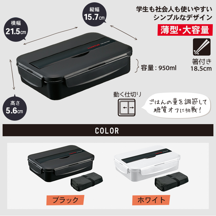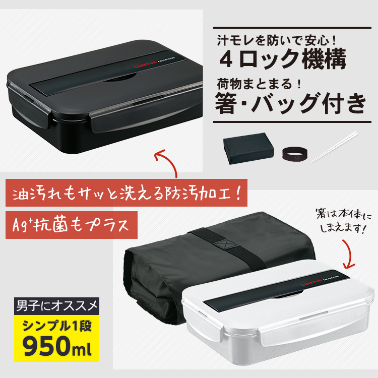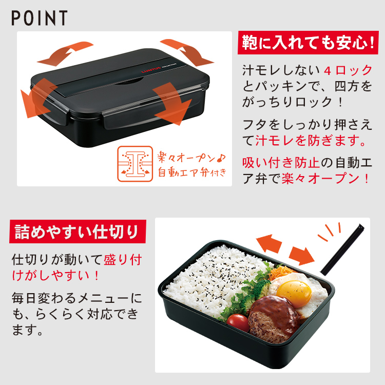 4点ロックで汁漏れを防ぐランチボックスです。詰めやすく洗いやすい1段タイプ。