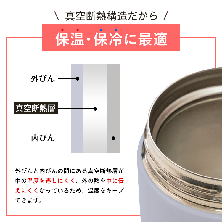 - 本体=ステンレス鋼(アクリル樹脂塗装)、フタ=PP(中材:発泡PP断熱材)、スプーン・フタカバー=PP、フタパッキン・エア弁=シリコーンゴム