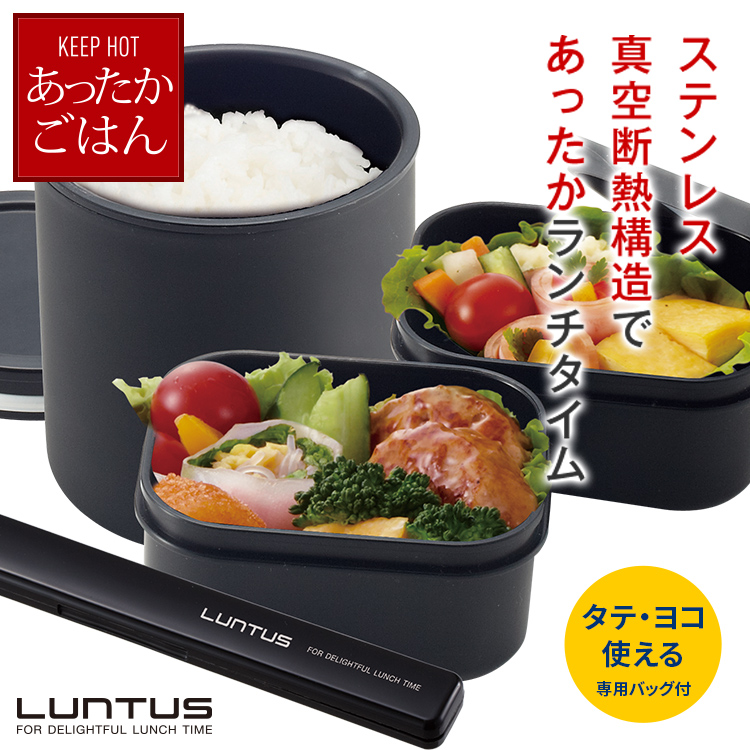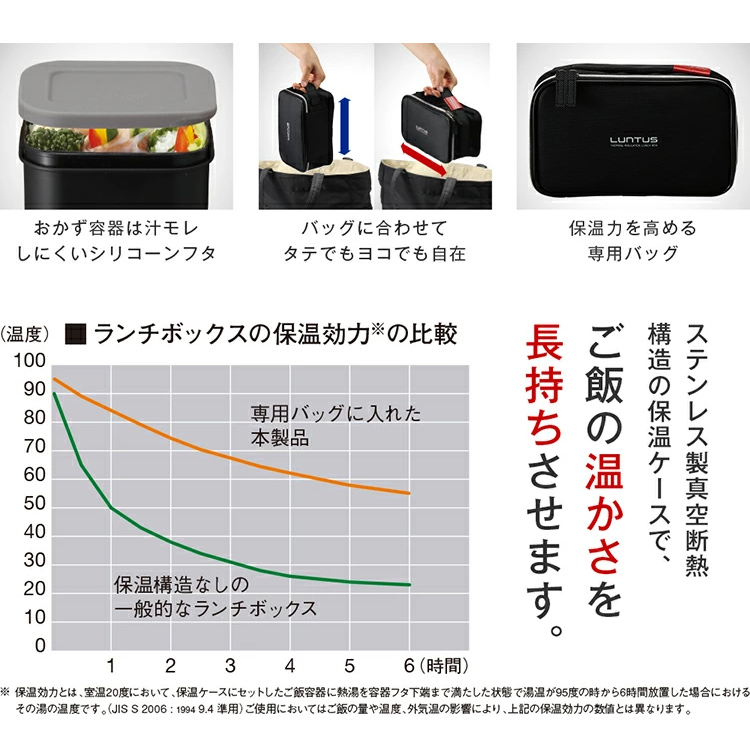 - 保温ケース=ステンレス鋼(アクリル樹脂塗装)、ご飯容器フタ=PP(中材:発泡PP断熱材)、ご飯容器本体・おかず容器本体・箸箱=PP、ご飯容器フタパッキン・おかず容器フタ=シリコーンゴム、箸=AS樹脂、専用ランチバッグ=ポリエステル/発泡PE/ナイロン/亜鉛合金