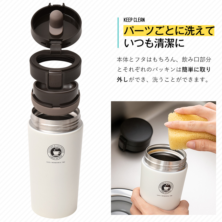 - 本体=ステンレス鋼(アクリル樹脂塗装)、飲み口・フタ・フタ本体=PP、ロックレバー=ABS樹脂、ストッパー=ポリアセタール、バネ・軸=ステンレス鋼、フタパッキン・飲み口パッキン=シリコーンゴム