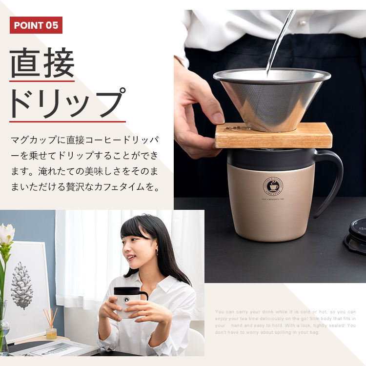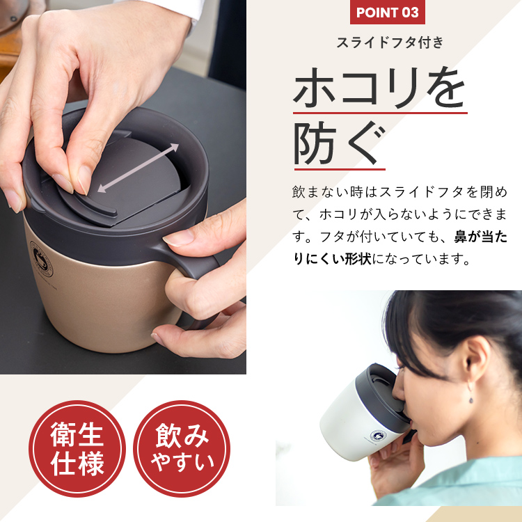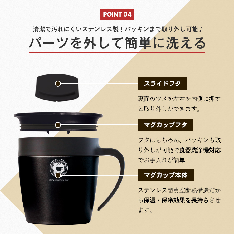 - 本体=ステンレス鋼(アクリル樹脂塗装)、ハンドル・スライドフタ・飲み口=PP、パッキン=シリコーンゴム