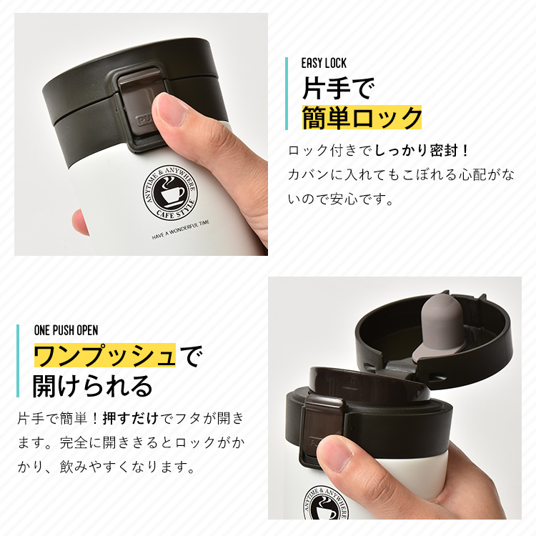 - 本体=ステンレス鋼(アクリル樹脂塗装)、飲み口・フタ・フタ本体=PP、ロックレバー=ABS樹脂、ストッパー=ポリアセタール、バネ・軸=ステンレス鋼、フタパッキン・飲み口パッキン=シリコーンゴム