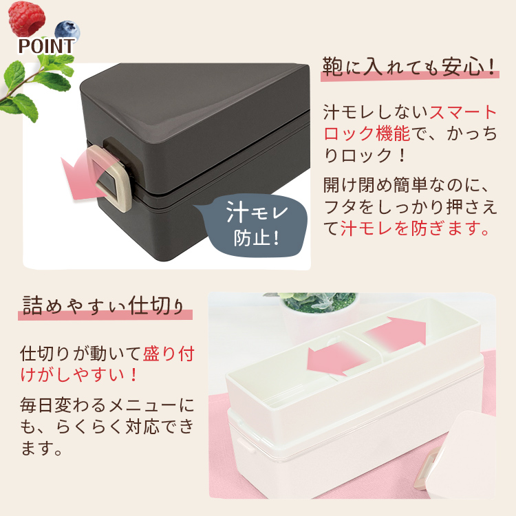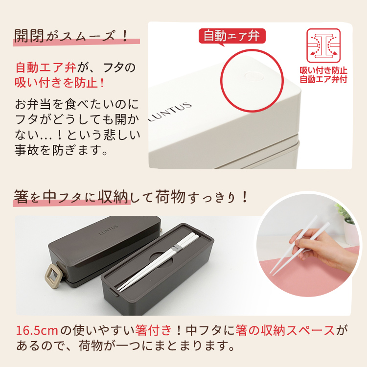 - 上下本体・下フタ・仕切り・止め具・弁本体=PP、上フタ・箸=AS樹脂、パッキン・エア弁=シリコーンゴム