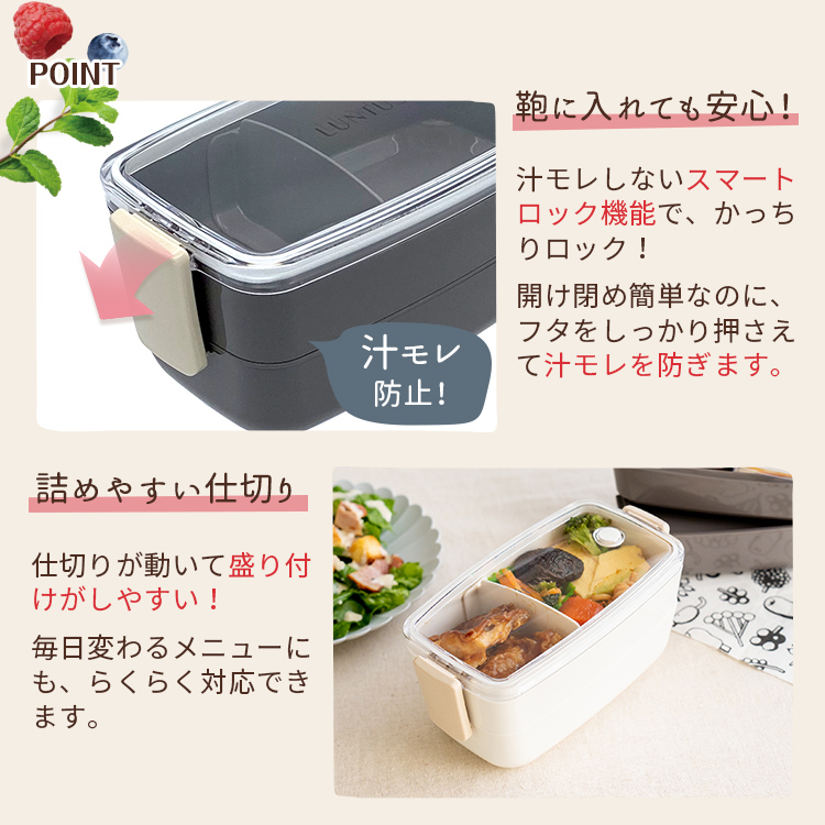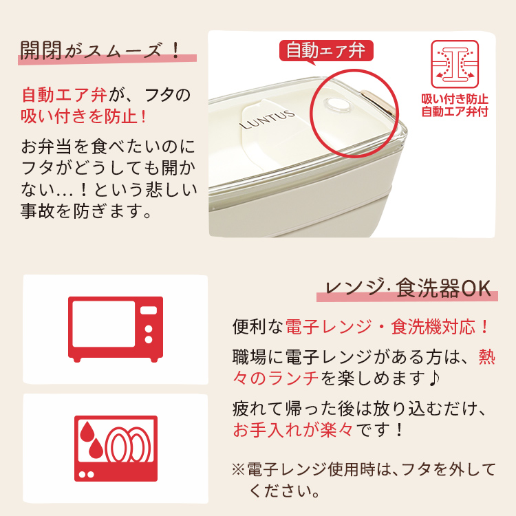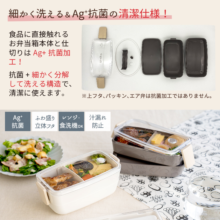 - 上下本体・下フタ・仕切り・止め具・弁本体=PP、上フタ=AS樹脂、パッキン・エア弁=シリコーンゴム