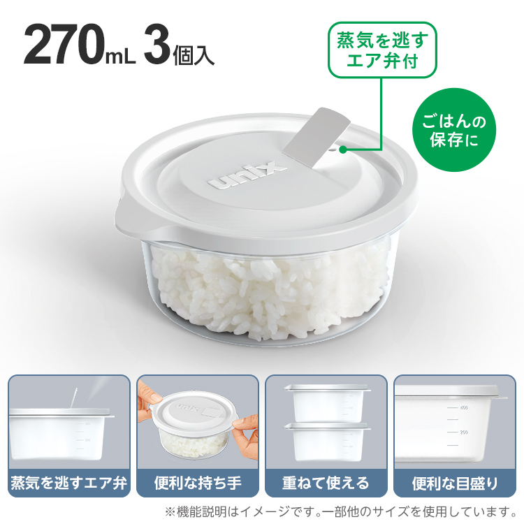 冷凍からレンジまで対応のお徳用保存容器です。ごはんの保存、加熱に便利な丸型タイプ。