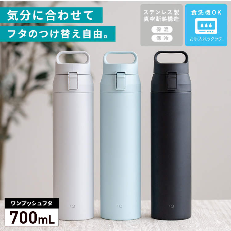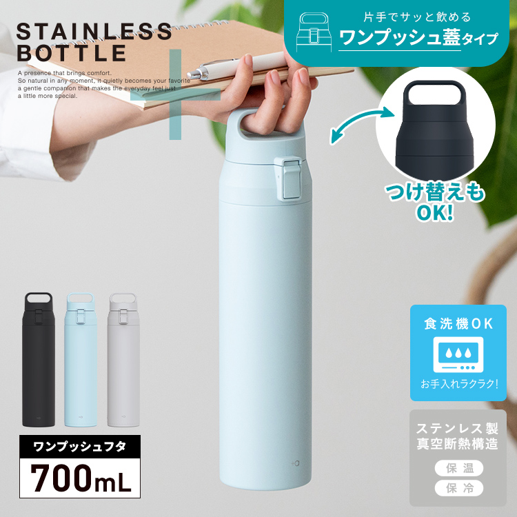 - 上フタ・下フタ・飲み口=ポリプロピレン、ロックレバー=ABS樹脂、ストッパー=ポリアセタール、バネ・軸=ステンレス鋼、上フタパッキン・飲み口パッキン=シリコーンゴム、本体容器(内瓶・口部)=ステンレス鋼、本体容器(胴部)=ステンレス鋼(ポリエステル樹脂塗装)