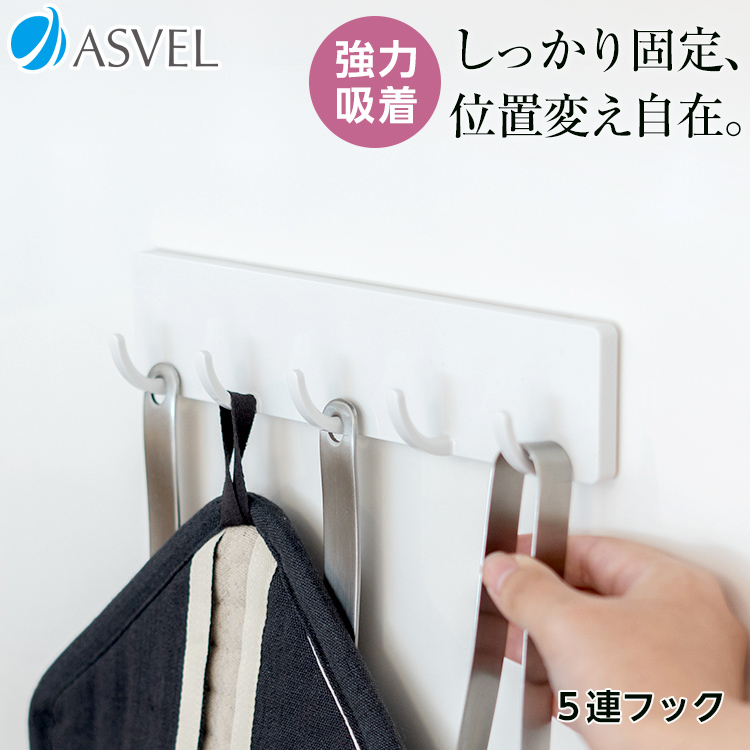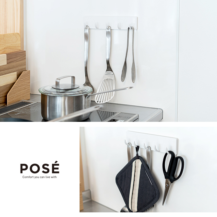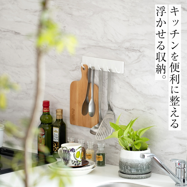 キッチンツールの収納にぴったりな5連フック。吸着シートは水洗いで粘着力が戻ります。