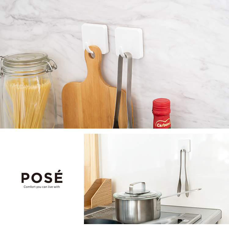 小物やキッチンツールなど色々つける便利なフック。吸着シートは水洗いで粘着力が戻ります。