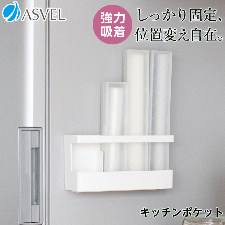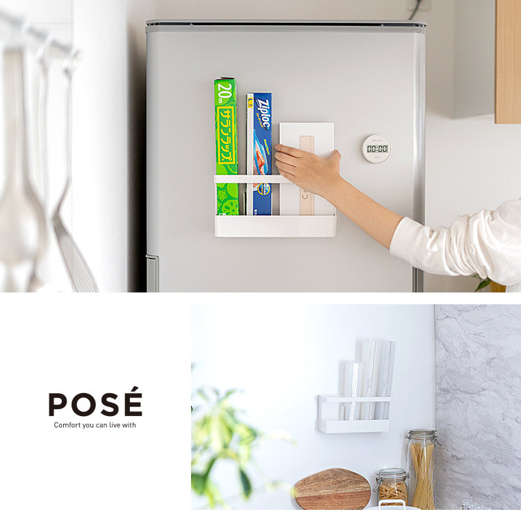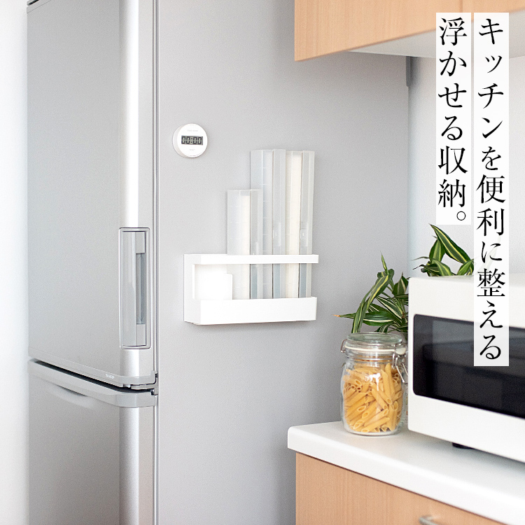 繰り返し貼ってはがせる吸着シートで取り付けられるキッチン消耗品収納です。