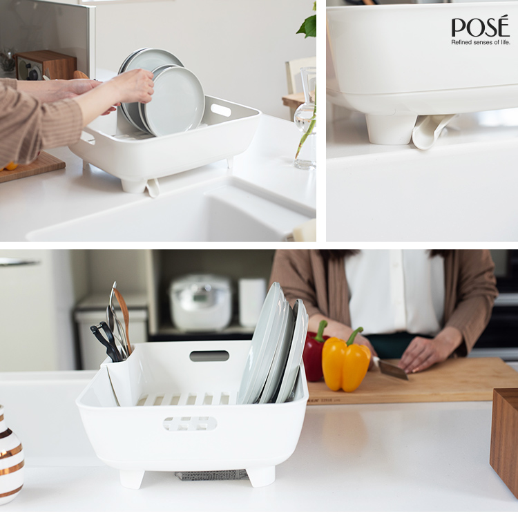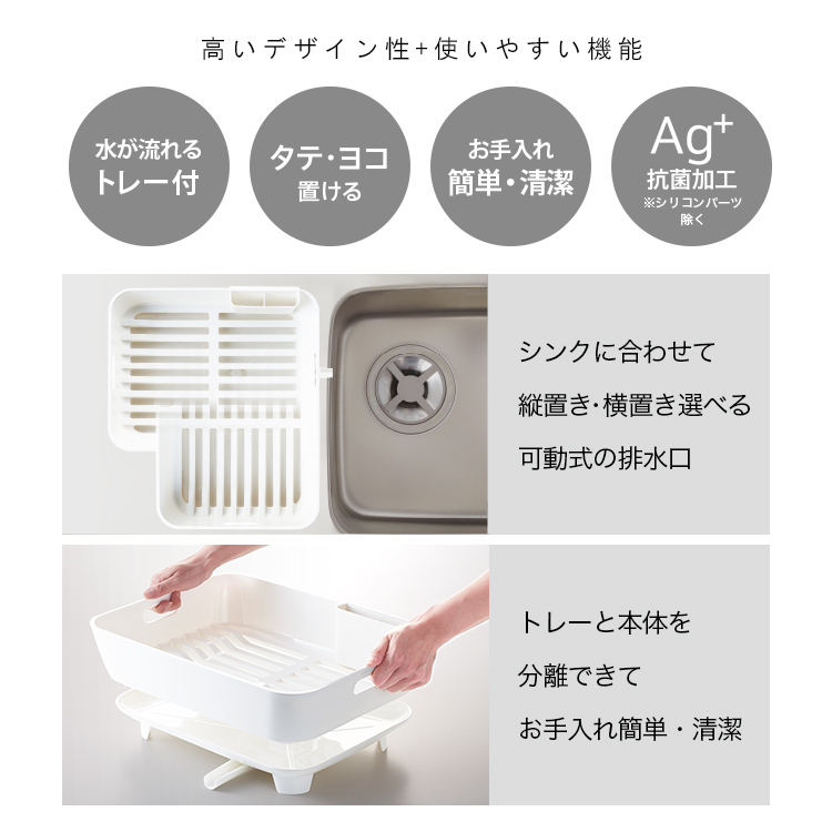水が流れる排水トレー付き。排水の向きが変えられるのでキッチンに合わせて設置できます。