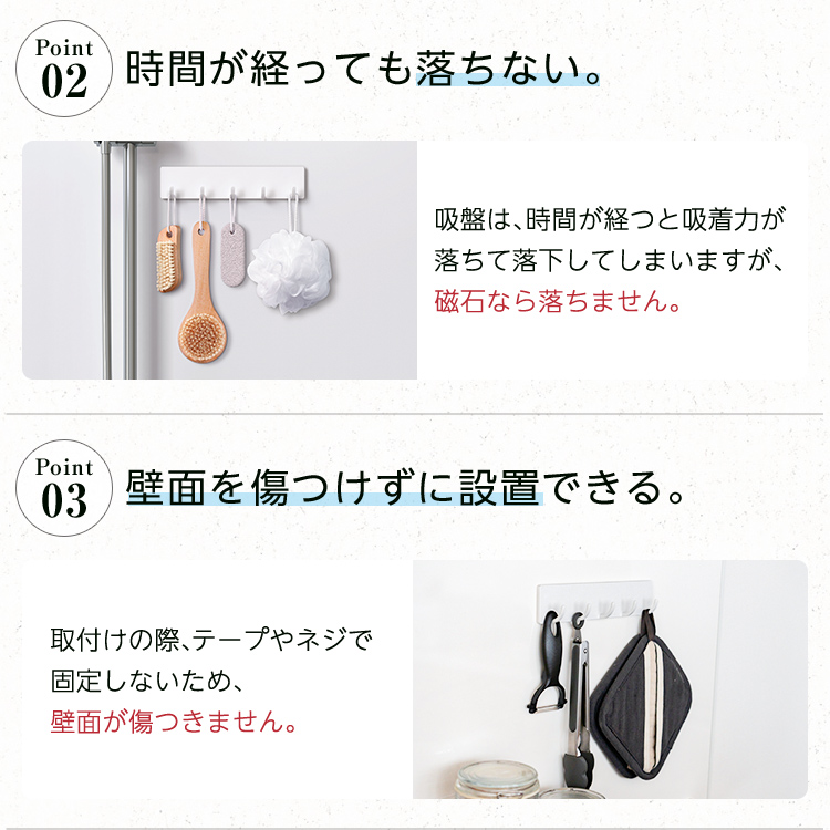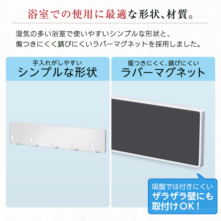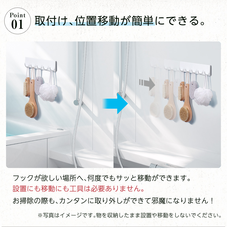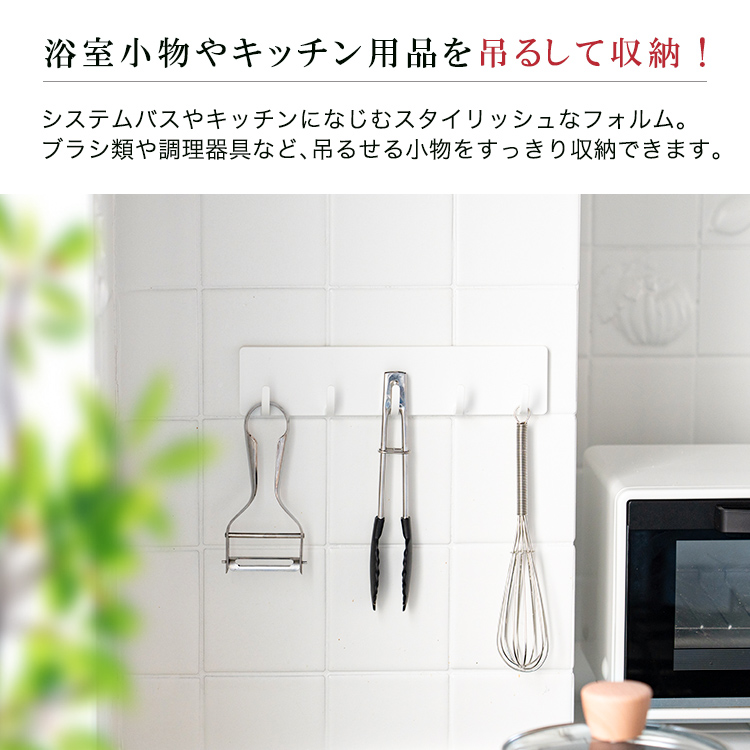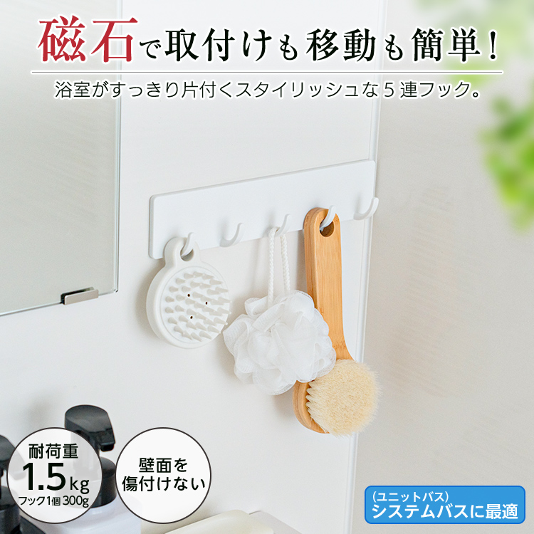 掃除用品やバスツールを引っ掛けるのに便利な5連フックです。