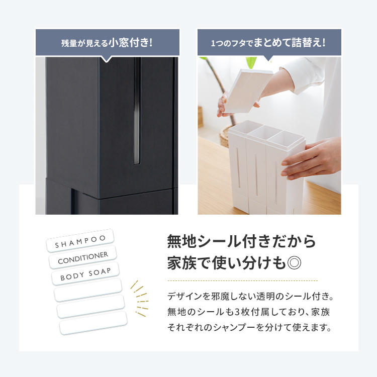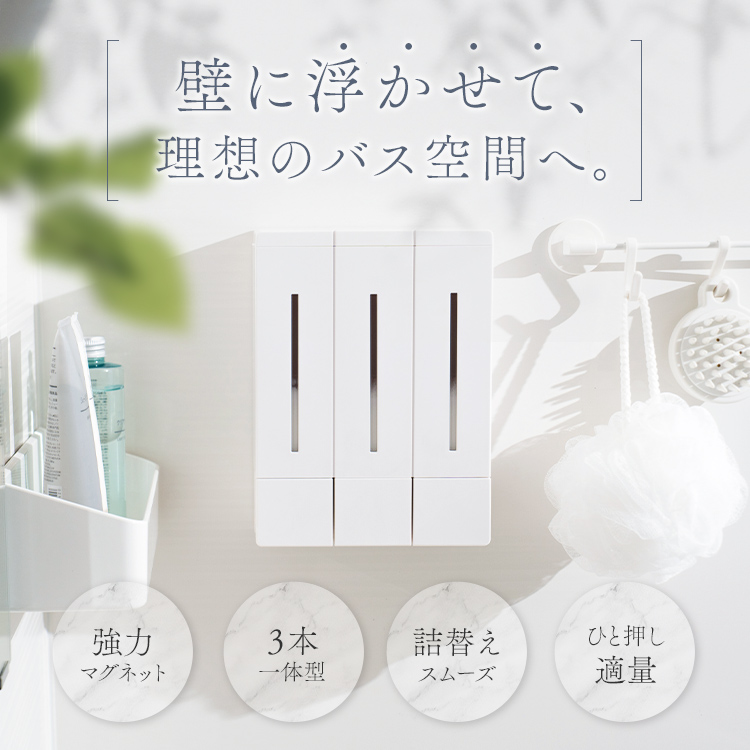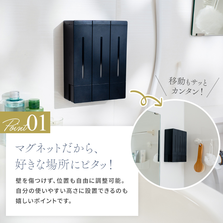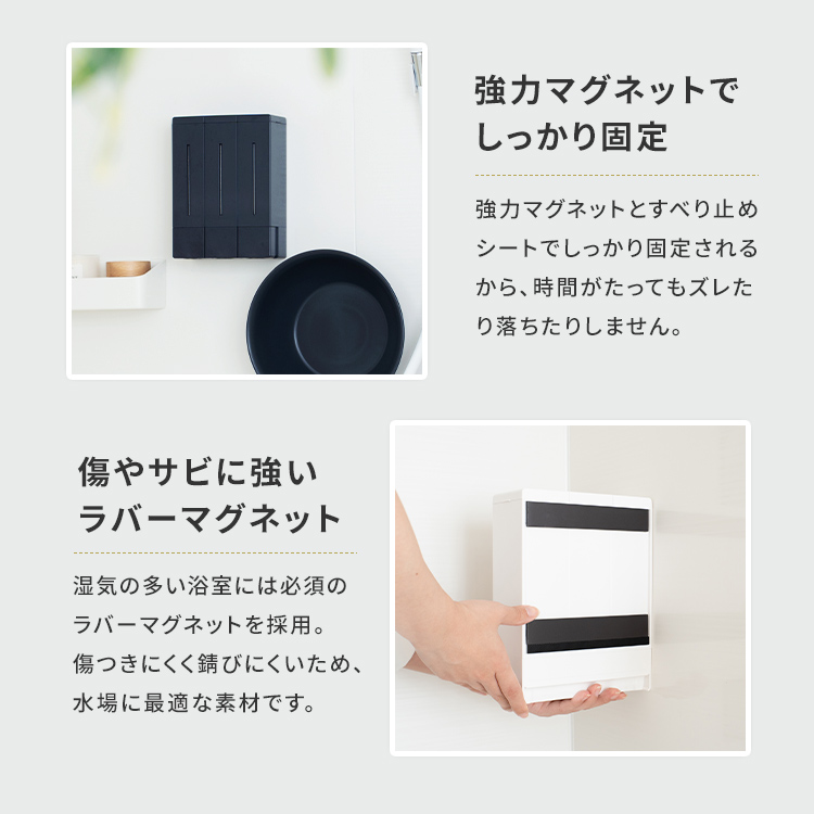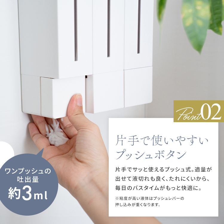 - 本体・フタ・プッシュレバー=ABS樹脂、マグネット=ラバーマグネット、ポンプ=シリコーンゴム/ABS樹脂、すべり止め=ポリウレタン