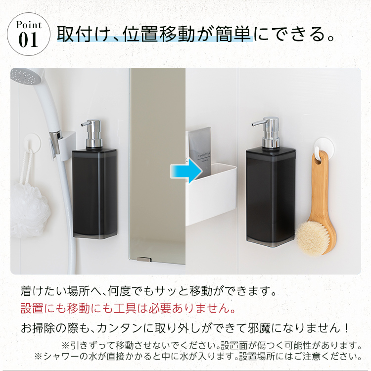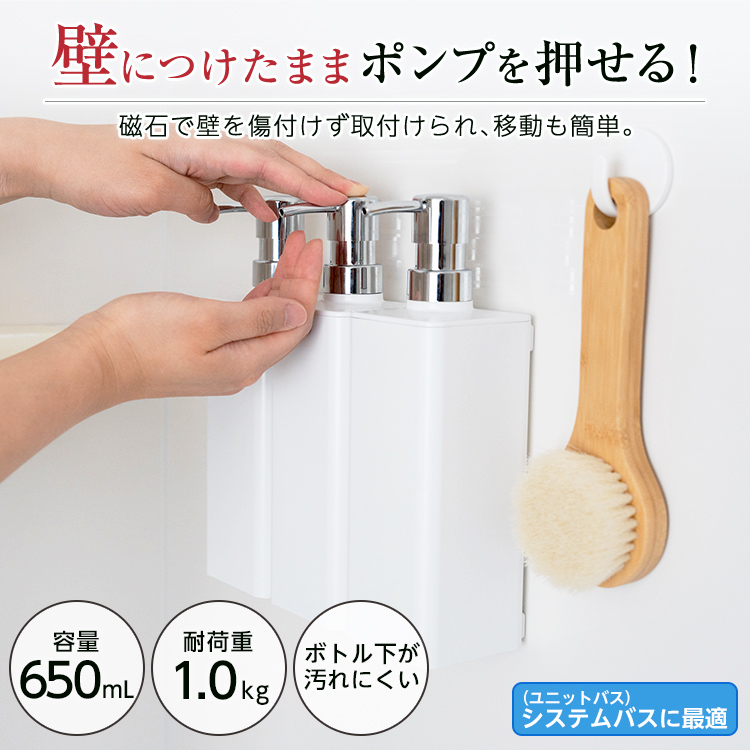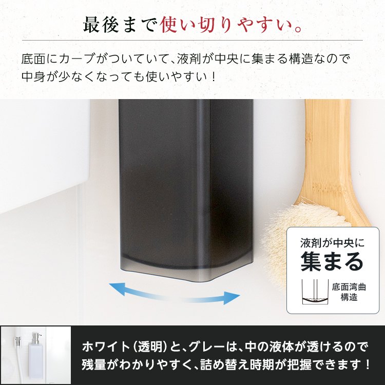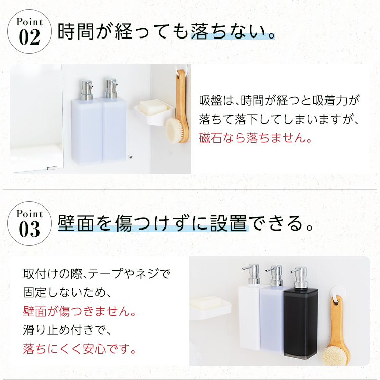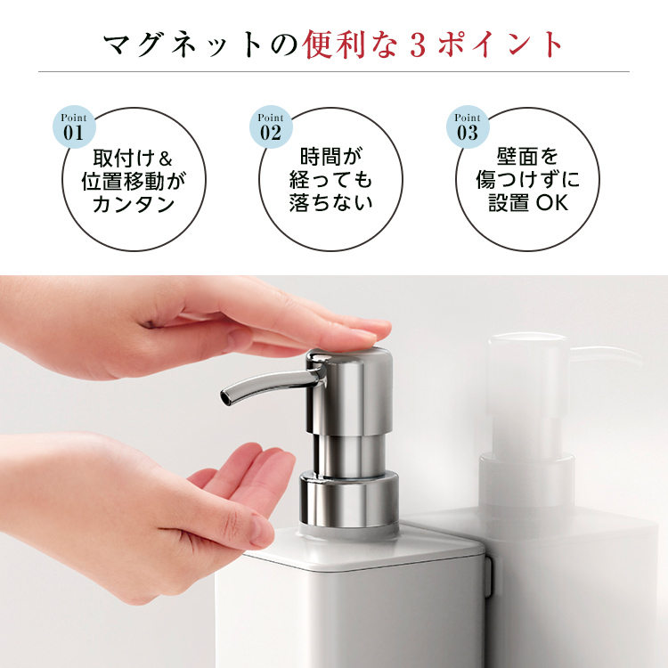 - 本体=AS樹脂/ラバーマグネット、フタ=AS樹脂、パッキン=シリコーンゴム、すべり止め=ポリウレタン、ポンプ=ABS樹脂(クロムめっき)/PP/ステンレス鋼/発泡PE