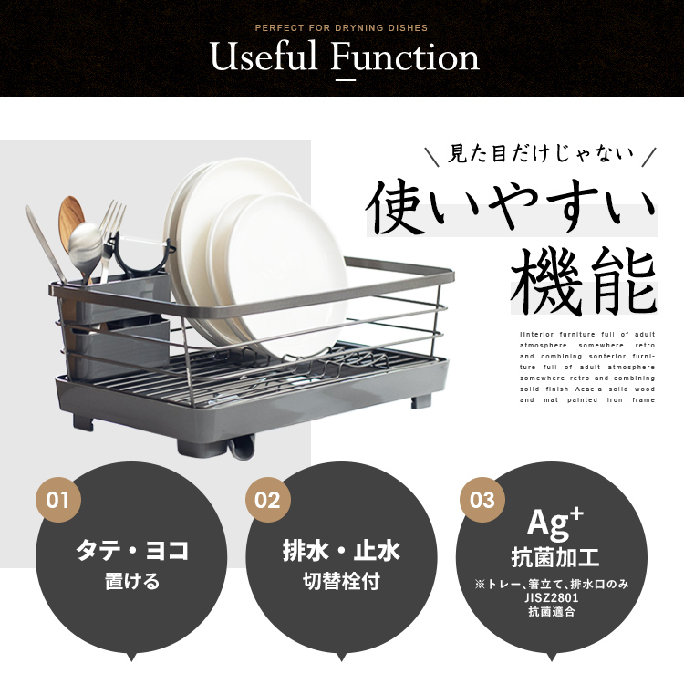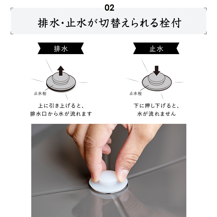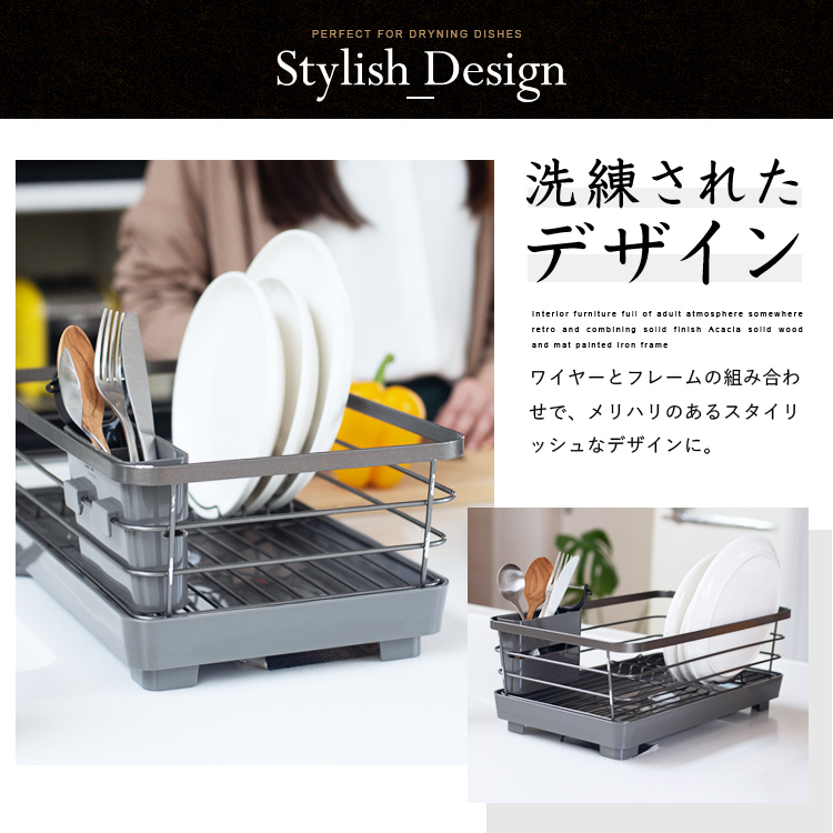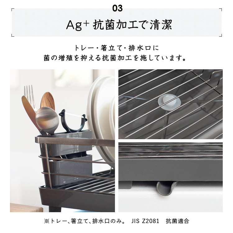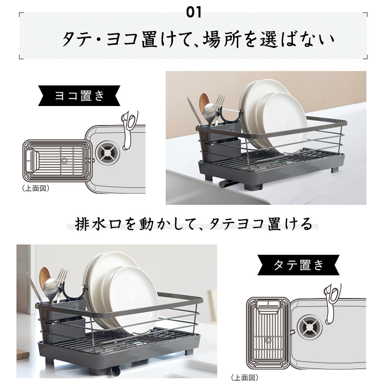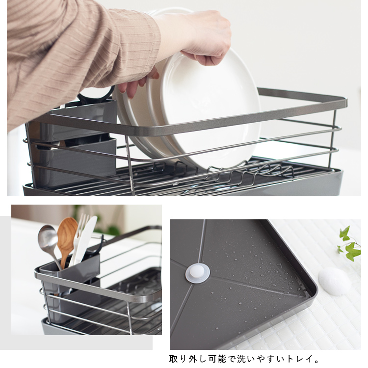 - 本体=鉄(樹脂コーティング)、トレー・箸立て・排水口=PP、止水栓=シリコーンゴム、ゴム脚=塩化ビニル樹脂