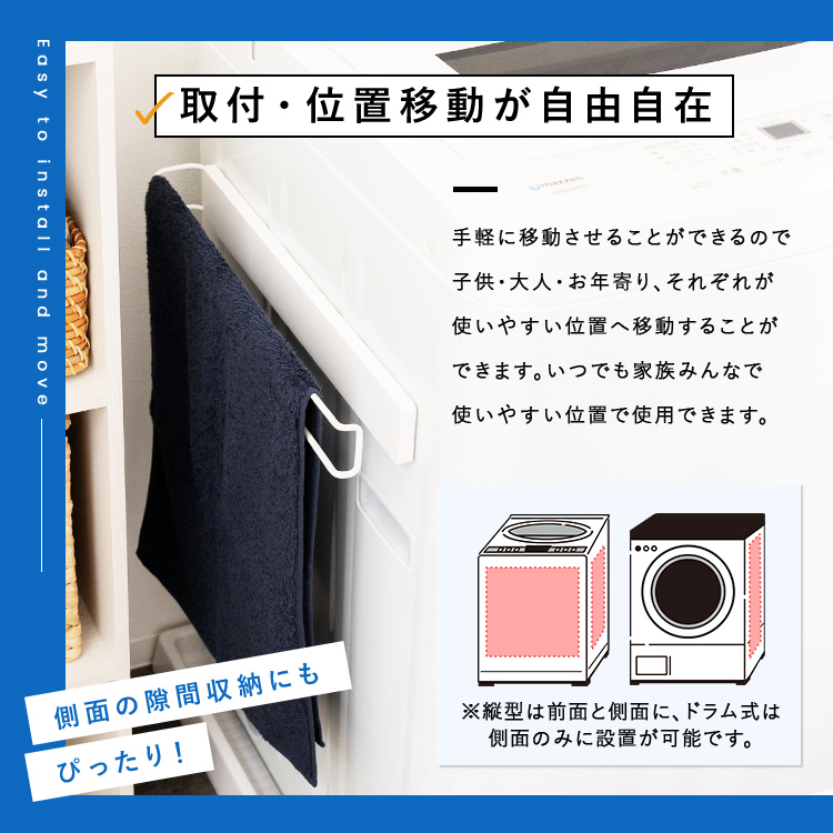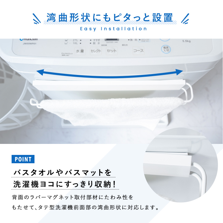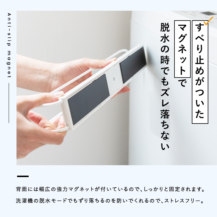 マグネットで洗濯機にしっかり取付!湾曲面に対応したマグネット設計でずれ落ちを防ぎます。