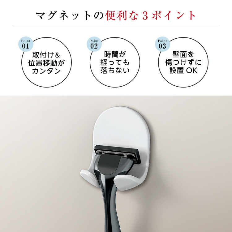 マグネットだから、使いたい場所に、取り出しやすい場所に、シェーバーを置くことができます。マグネットなので自由自在に取り付け、取り外しも簡単。