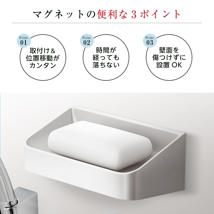 大人気のお風呂の浮かせる収納シリーズ!マグネットだから磁石が着く場所なら自由自在に取り付け、取り外しも簡単。水切り付きなのでお掃除も簡単。便利な石けんトレーです。
