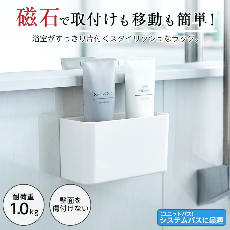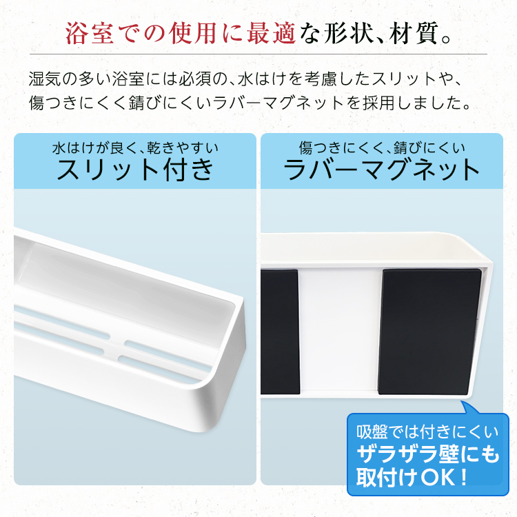 大人気のお風呂の浮かせる収納シリーズ!マグネットだから磁石が着く場所なら自由自在に取り付け、取り外しも簡単。水切り付きなのでお掃除も簡単。インテリアになじむシンプルなラックです。