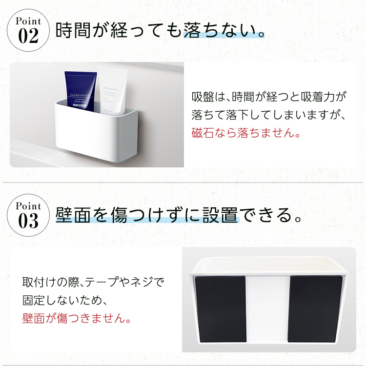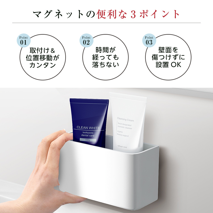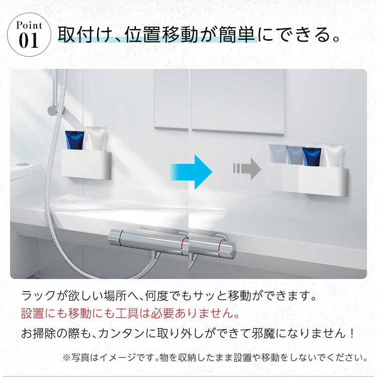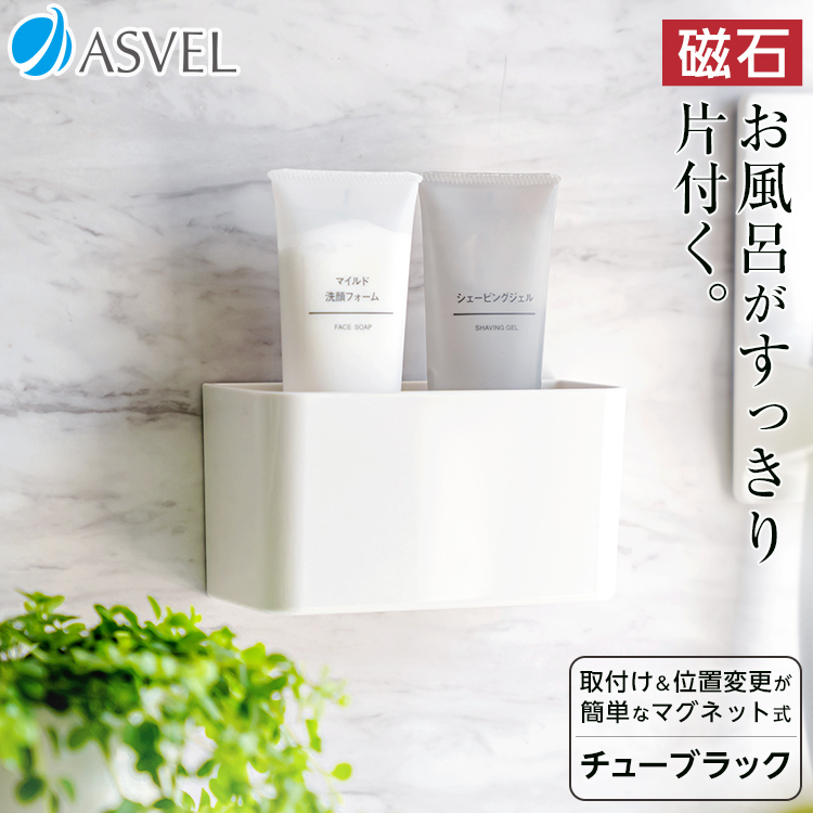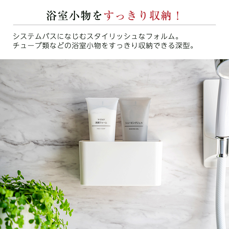 磁石の力でお風呂の壁につけられるチューブ類など小物収納に便利なラックです。