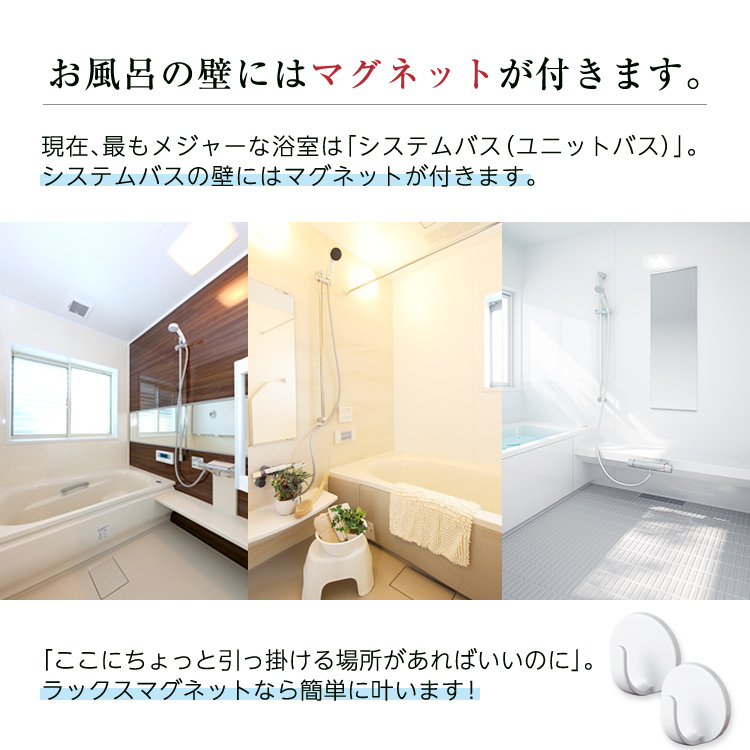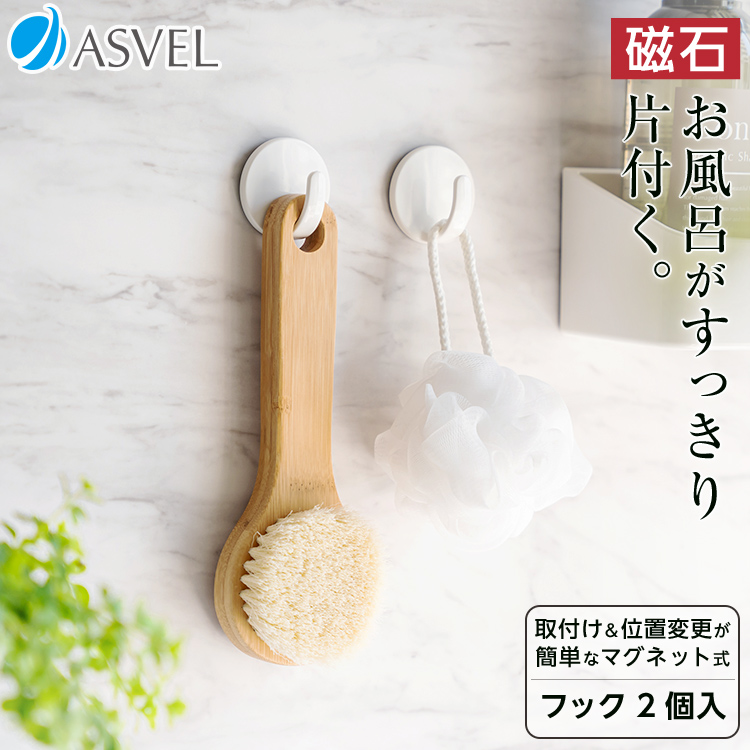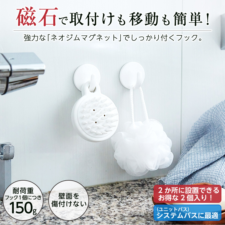 磁石の力でお風呂の壁につけられるシンプルなフック。2個入りです。