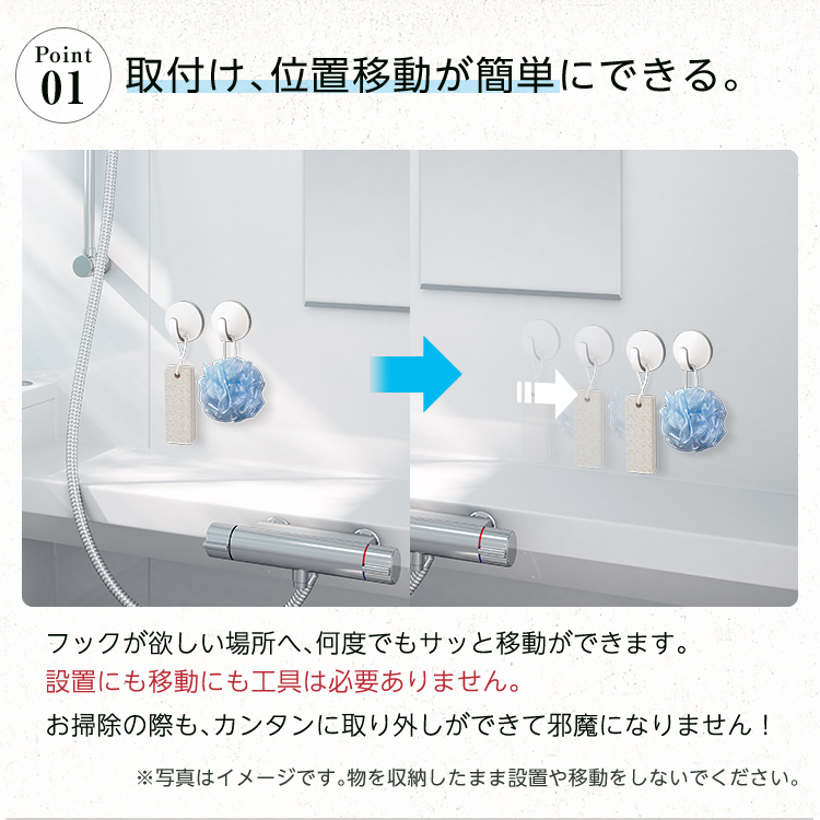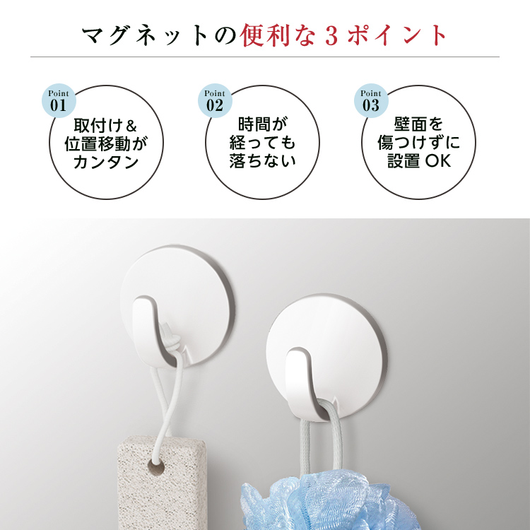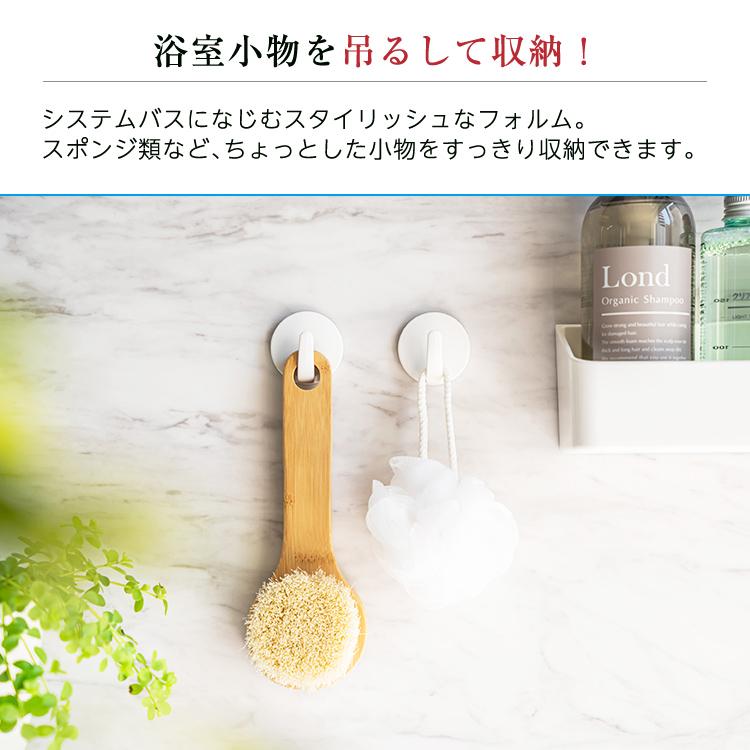 大人気のお風呂の浮かせる収納シリーズ!マグネットだから磁石が着く場所なら自由自在に取り付け、取り外しも簡単。お掃除道具やスポンジ、ボディータオルを引っ掛けるのに便利なフックです。