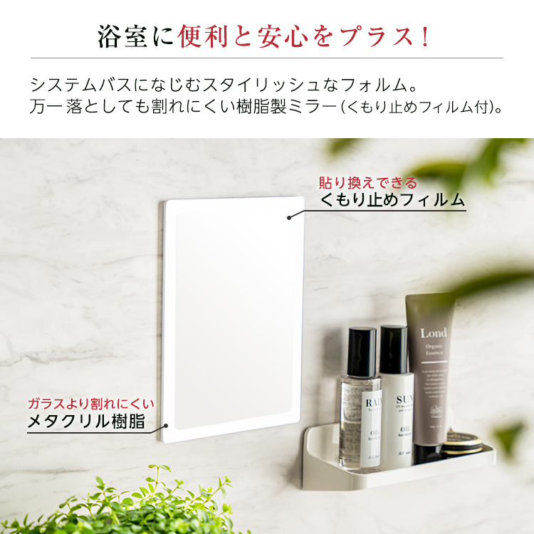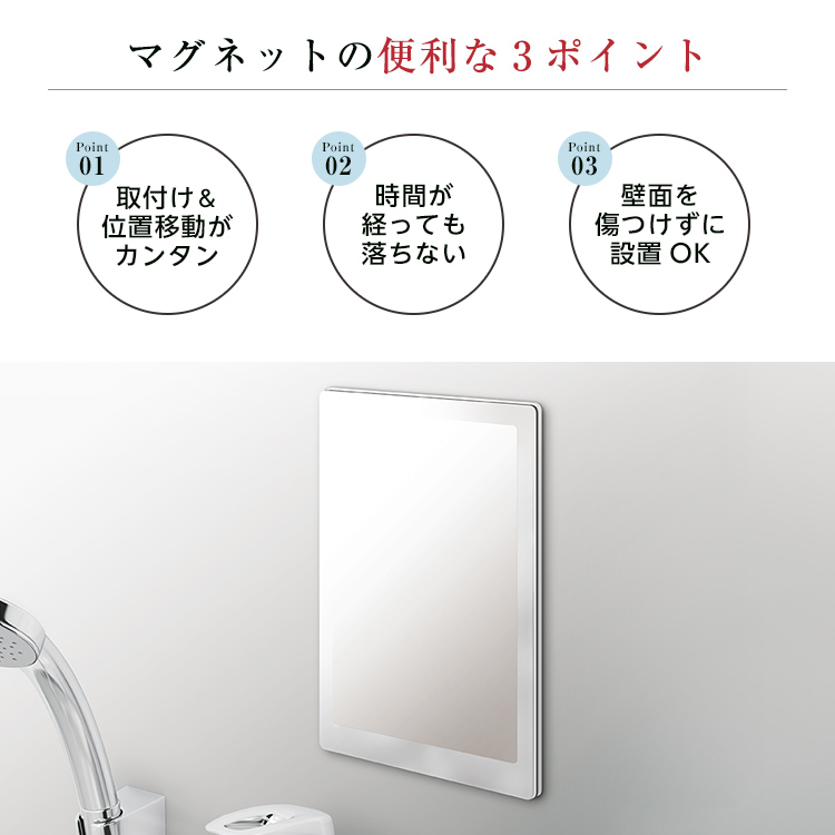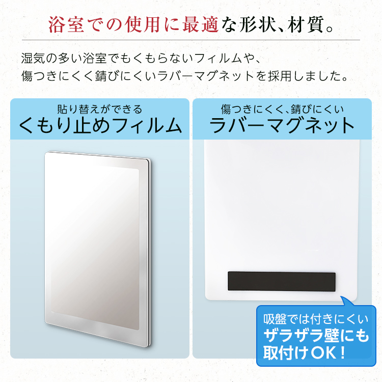 磁石の力でお風呂の壁につけられるくもり止めミラーです。