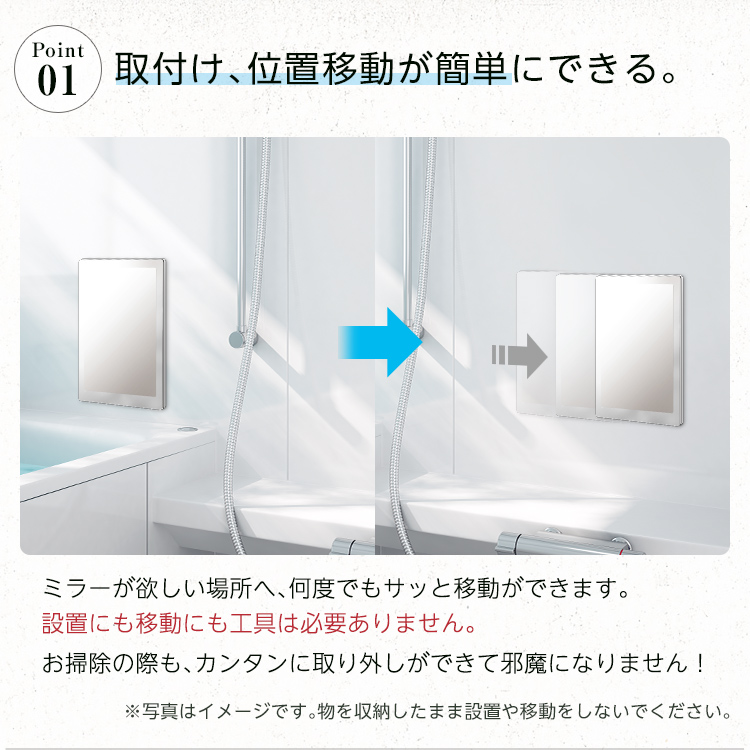 磁石の力でビタッとついて、浴室の壁を傷つけません。マグネットだから、使いたい場所に、自由自在に取り付け、取り外しも簡単。