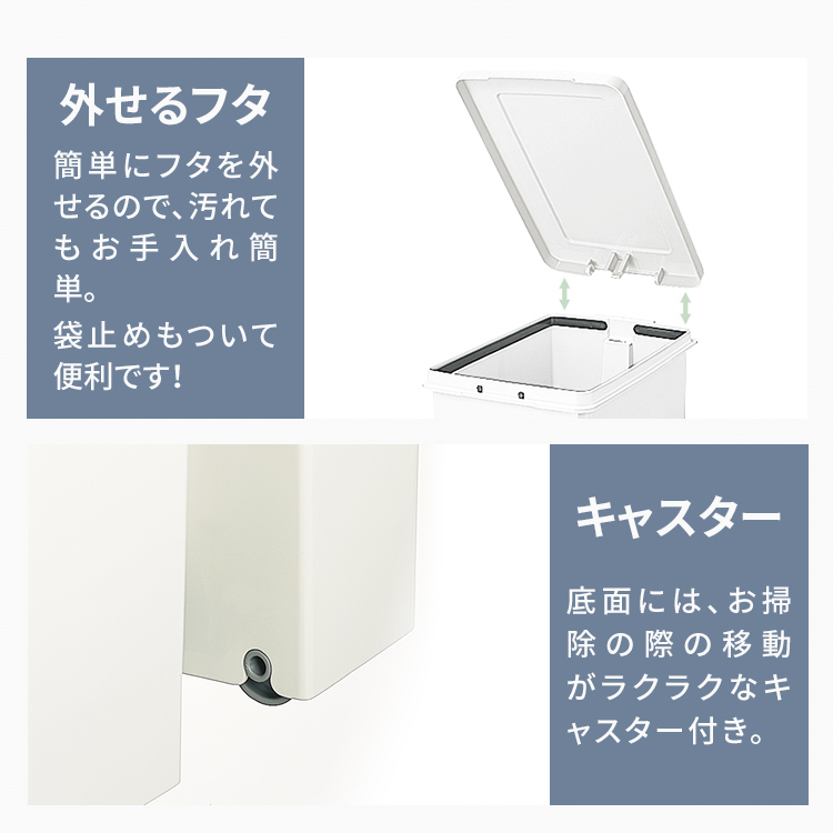キッチンのすき間にぴったり収まるスリムタイプ。スリッパでも踏みやすいペダル形状。レジ袋を掛けられるサイドフック付きです。