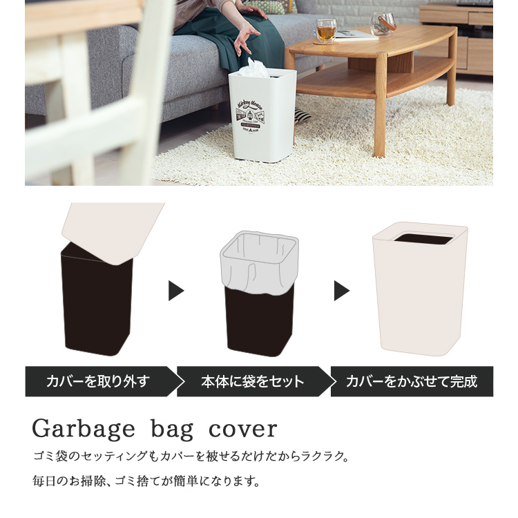 中容器とカバーで袋が見えない構造のゴミ箱のミッキーデザインです。