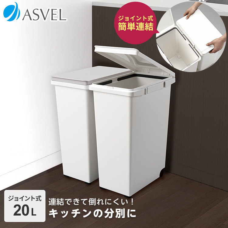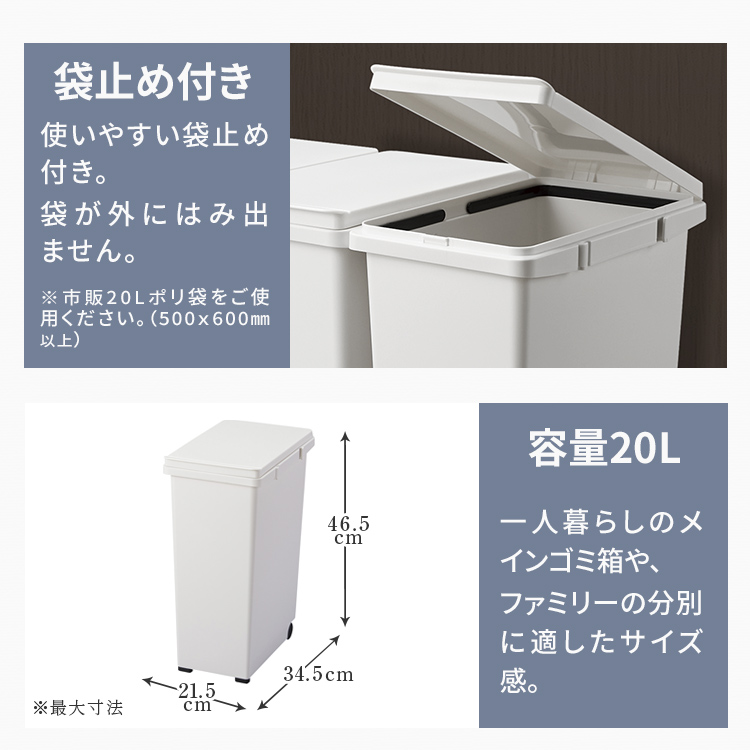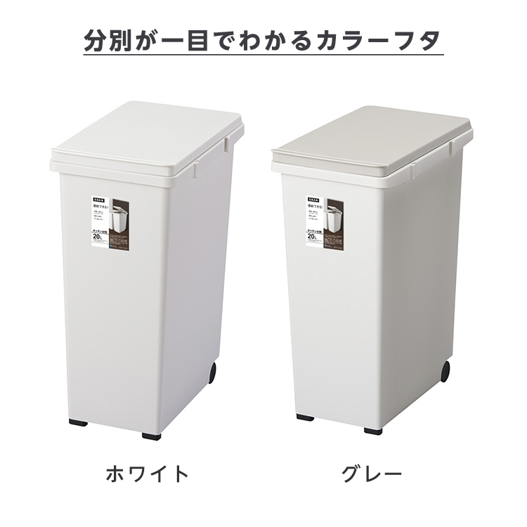 20Lのスリム設計でキッチン分別に最適なゴミ箱です。ゴム脚とキャスター付きでフローリングを傷つけません。