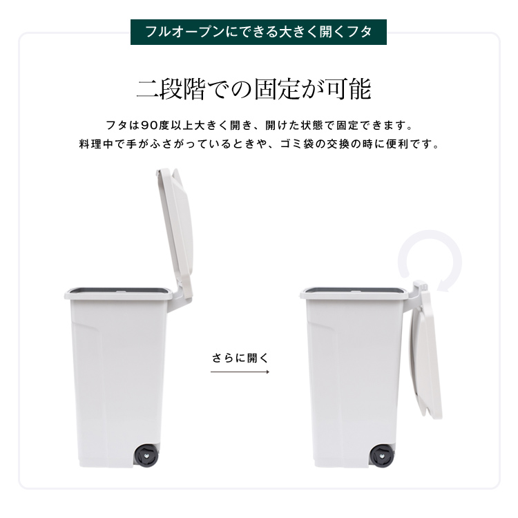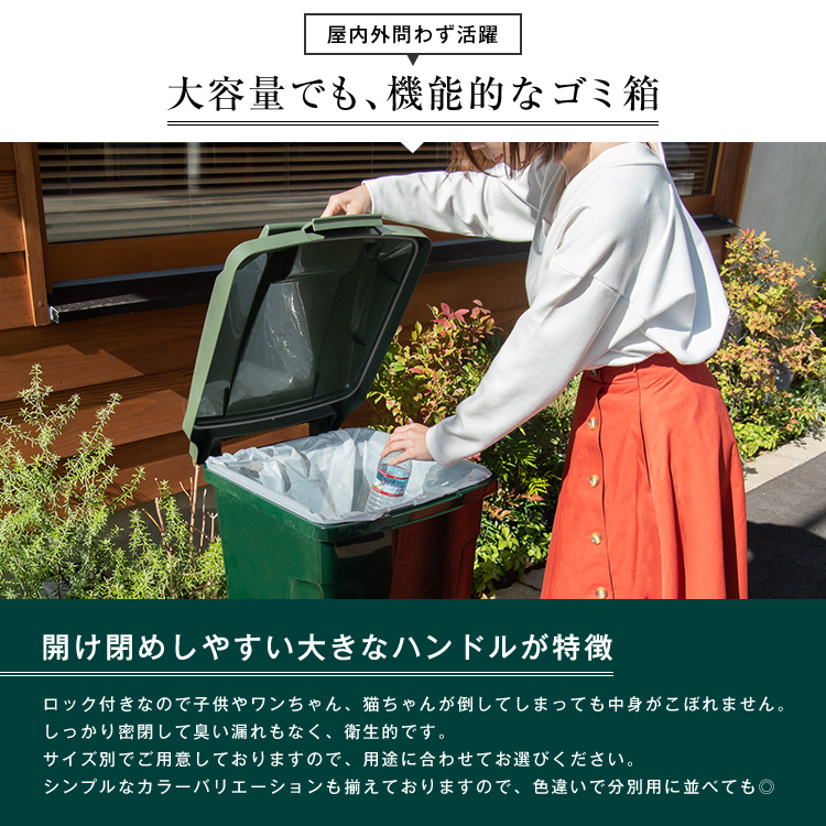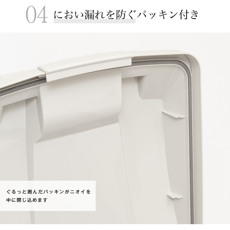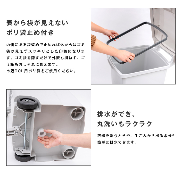 - 本体・フタ・止め具・ポリ袋止め・転倒防止スタンド・取付リング=PP、フタパッキン=発泡PE、車軸・ワッシャー・ネジ=スチール、後輪=TPR/PP、ナット=ナイロン/スチール、排水栓=PE、排水栓パッキン=シリコーンゴム