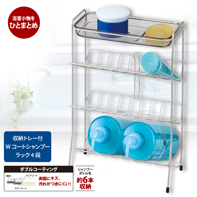 省スペースでたっぷり収納できる4段形状。石けんトレー付きです。