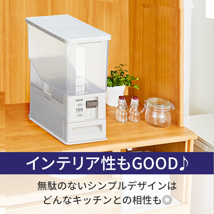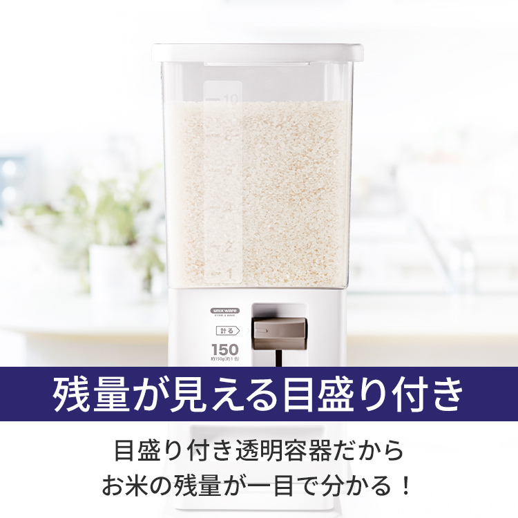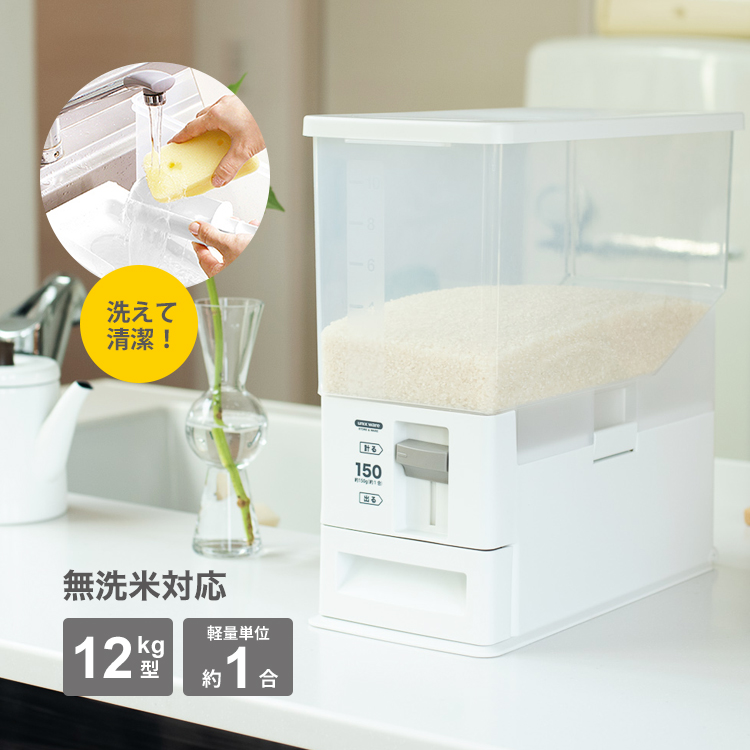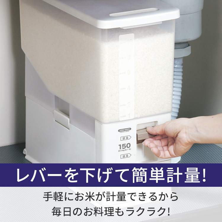 レバーを下げて簡単に計量(1合)できる米びつ12キロタイプです。