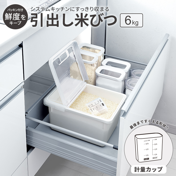 シンクの引出しに、お米の保存するのに便利な引き出し用米びつ6キロタイプです。