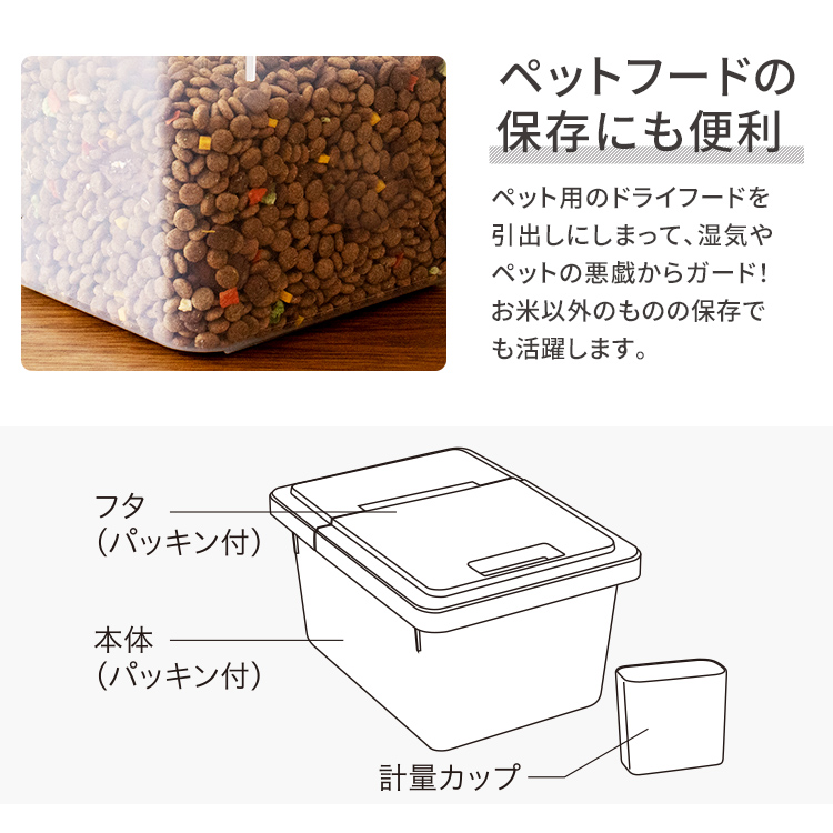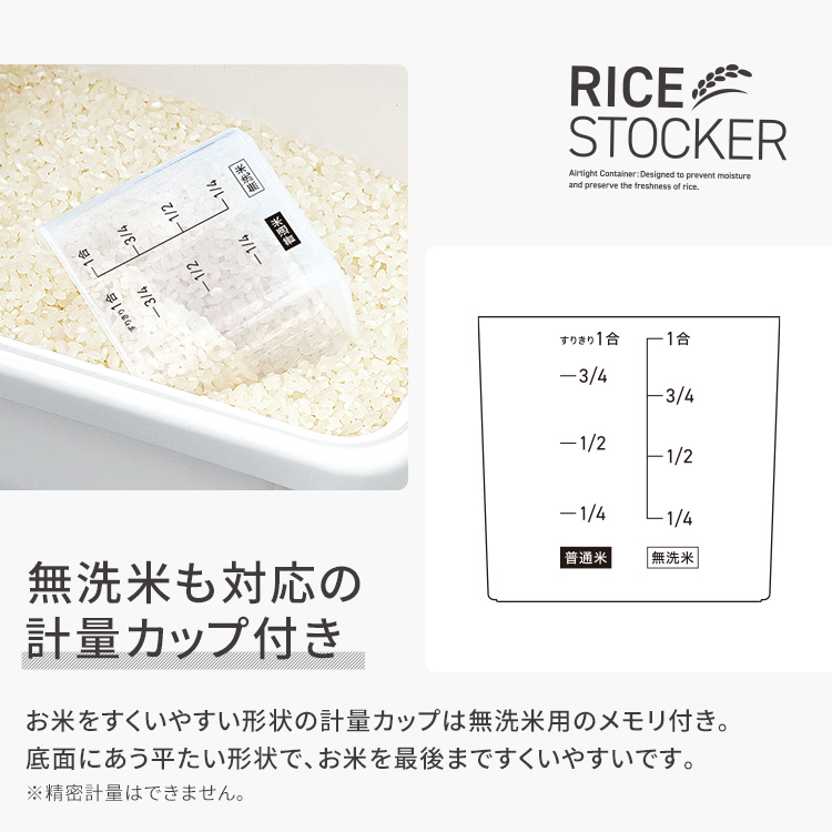 パッキン付きライスストッカーなので、お米の酸化を防ぎ、美味しさを保ちながら保存できます。計量に便利な計量カップ付き。無洗米にも対応しています