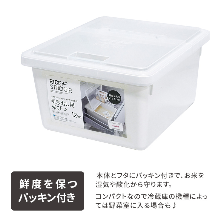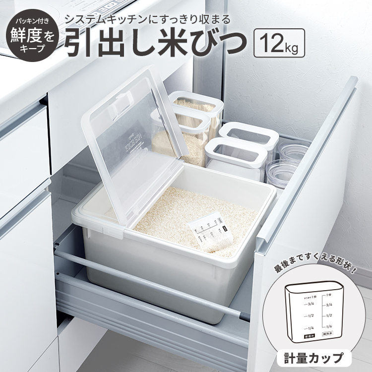 シンクの引出しに、お米の保存するのに便利な引き出し用米びつ12キロタイプです。
