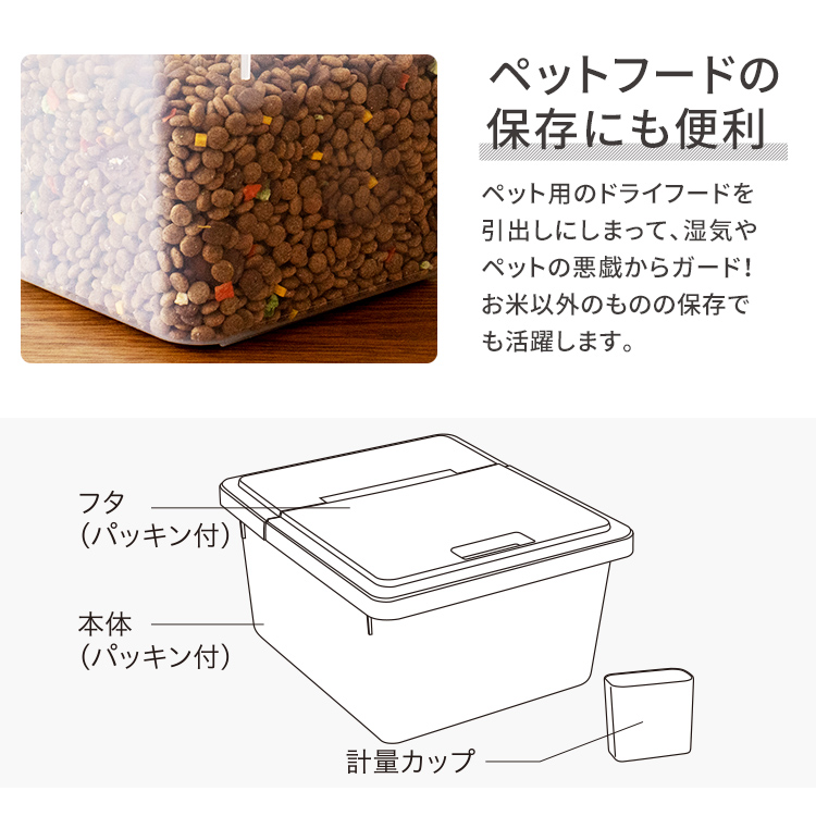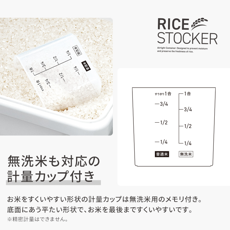 パッキン付きライスストッカーなので、お米の酸化を防ぎ、美味しさを保ちながら保存できます。計量に便利な計量カップ付き。無洗米にも対応しています