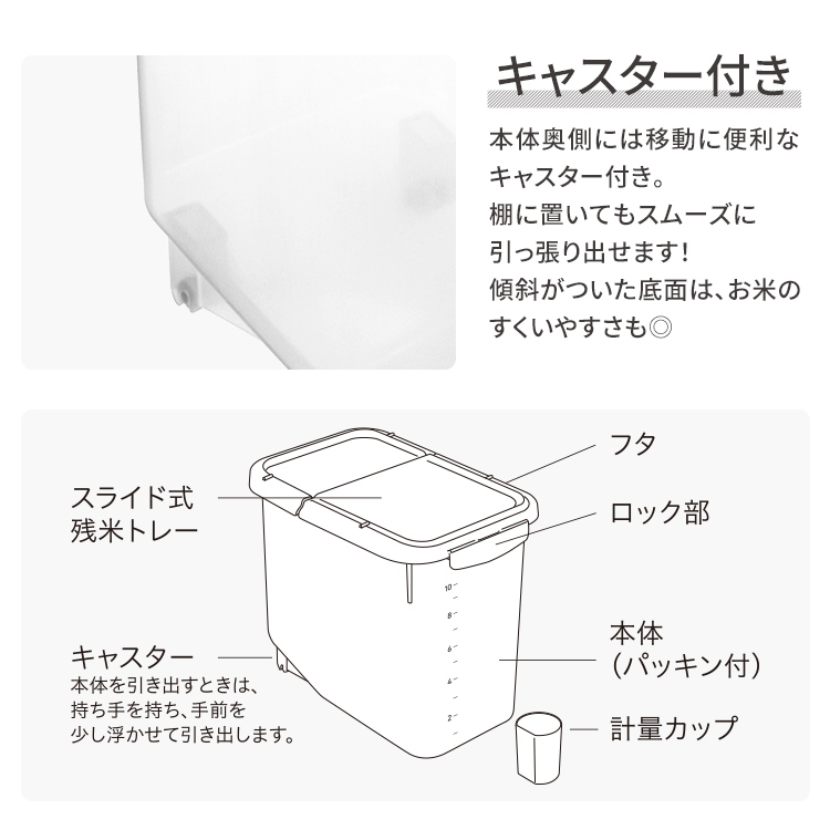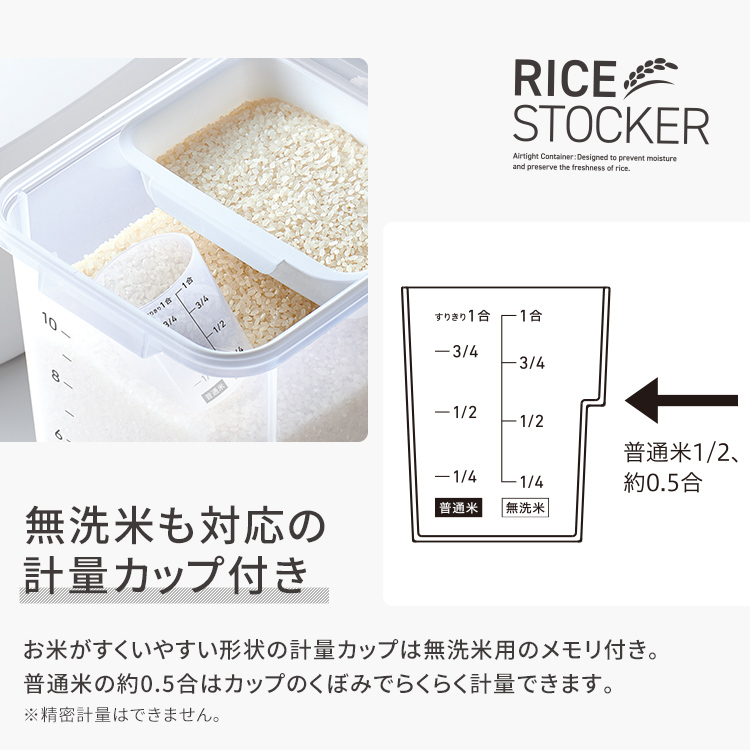 パッキン付きで完全密閉だから、お米の酸化を防ぎ、美味しさを保ちます。計量に便利な計量カップ付き。無洗米対応のライスストッカーです。