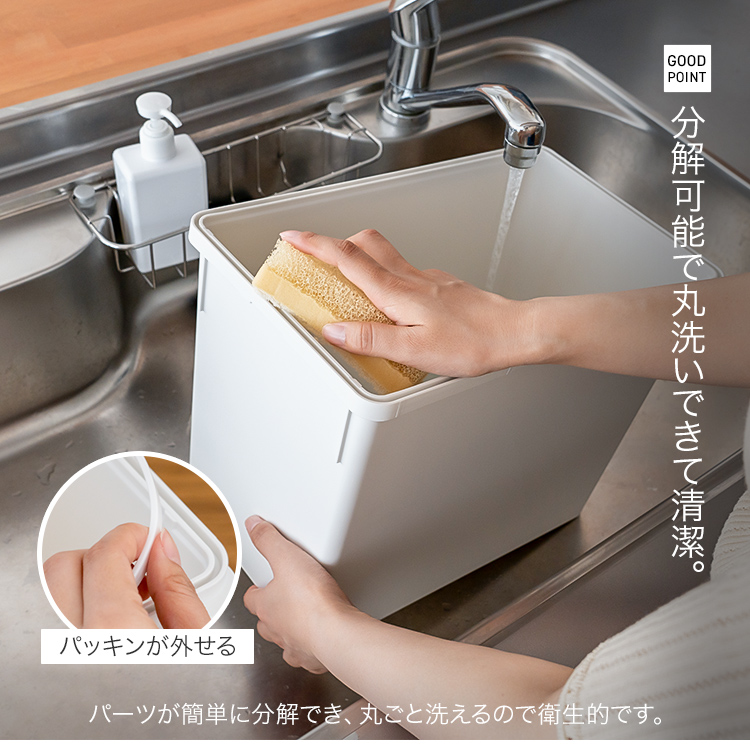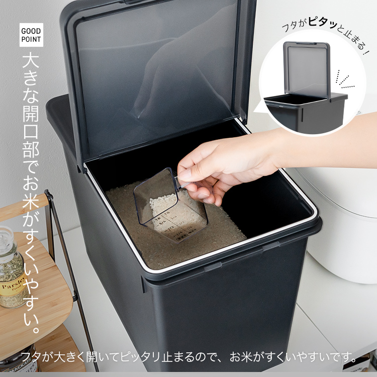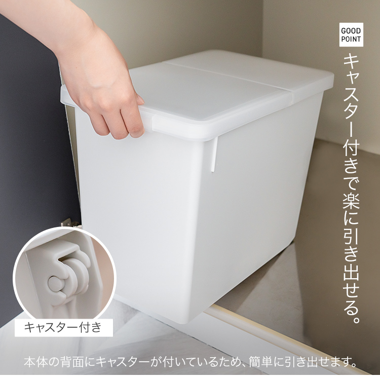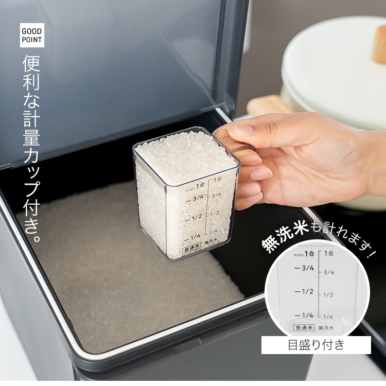 - 本体・フタ・止め具・キャスター=ポリプロピレン、計量カップ=AS樹脂、パッキン=シリコーンゴム