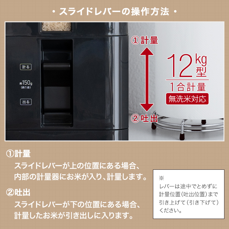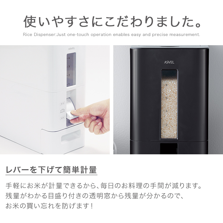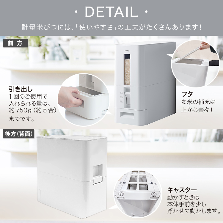 - 上下本体・止め具・キャスター・計量器カバー・引出し=PP、フタ・フタ枠・底板・計量器・レバー・ストッパー・無洗米アダプター=PS、透明窓=AS樹脂、パッキン=シリコーンゴム、クッション=発泡PE、脚ゴム=PE