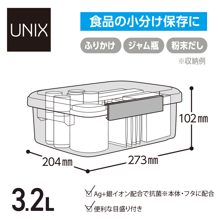 かさばる食品もしっかり収納できます!本体フタにAG抗菌配合、便利な目盛りつき。