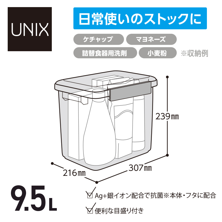 かさばる食品もしっかり収納できます!本体フタにAG抗菌配合、便利な目盛りつき。