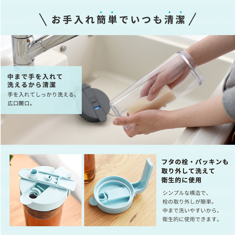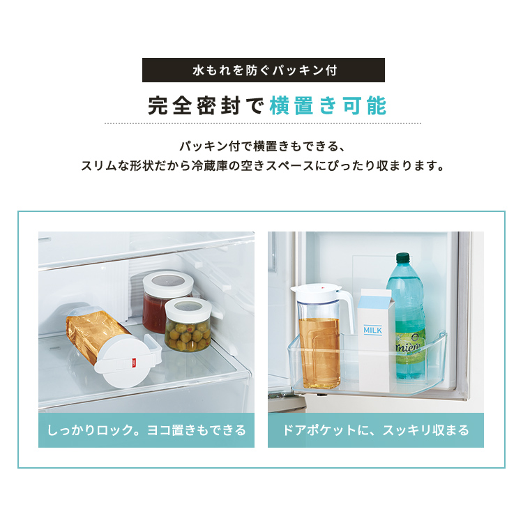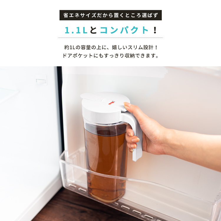 ワンプッシュで操作できるので、簡単に開閉。冷蔵庫のドアポケットに入る設計。また耐熱仕様で、麦茶などの煮出しも可能。ハンドル付きで使いやすい冷水筒です。