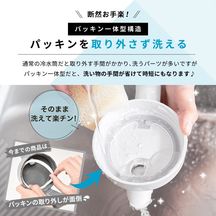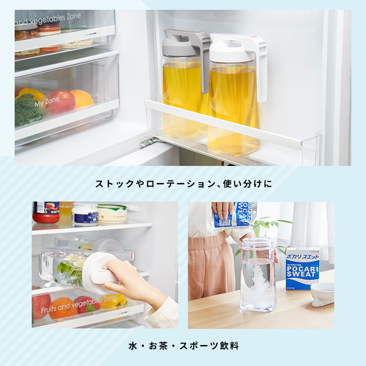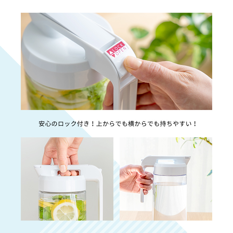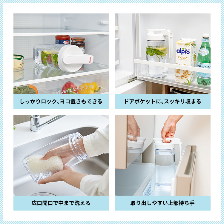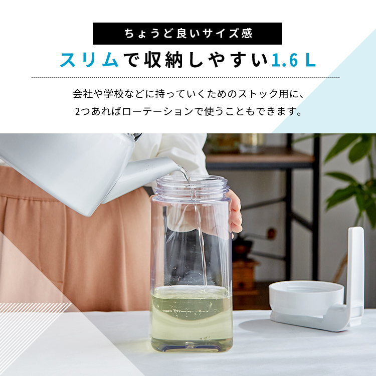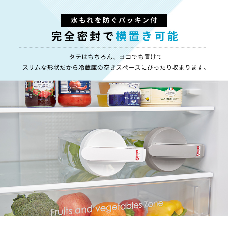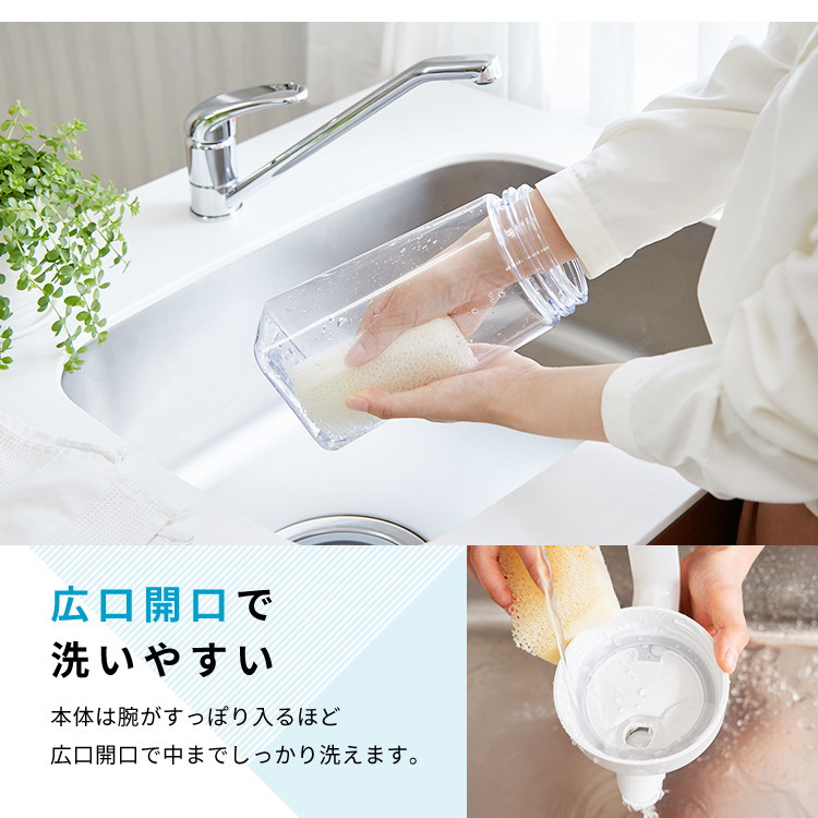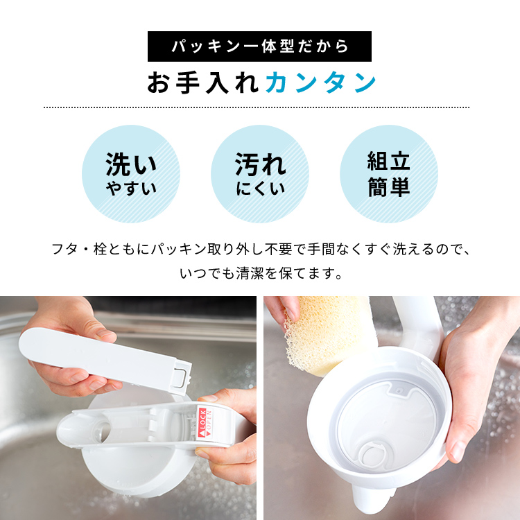 - 本体=AS樹脂、止め具=ABS樹脂、フタ=PP/熱可塑性エラストマー、栓・栓パッキン=ABS樹脂/シリコーンゴム