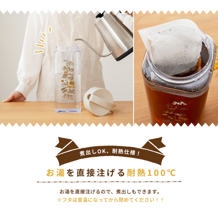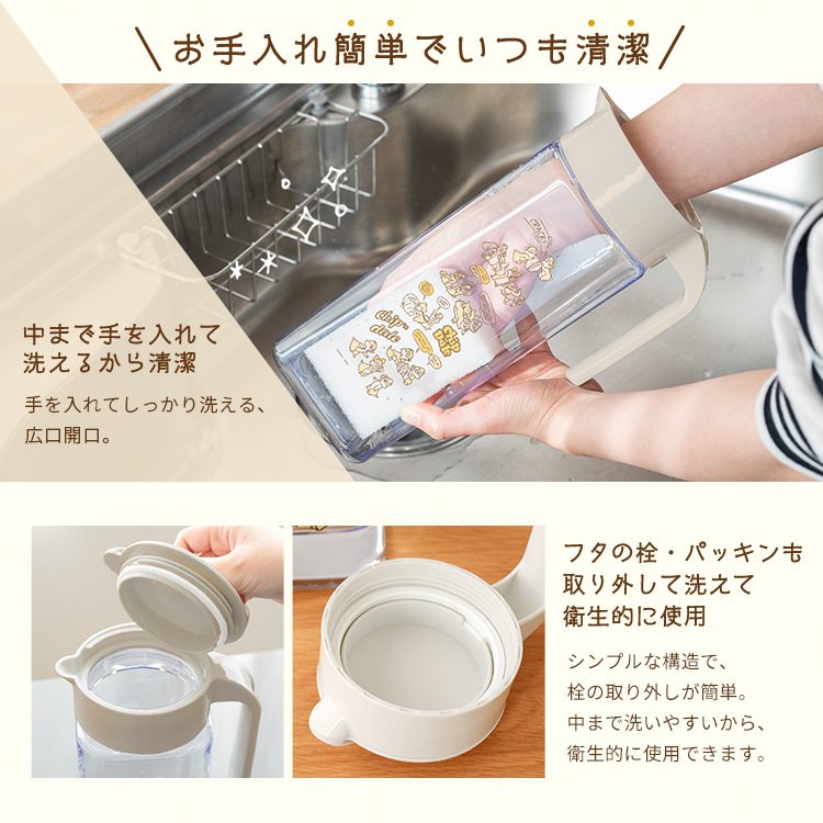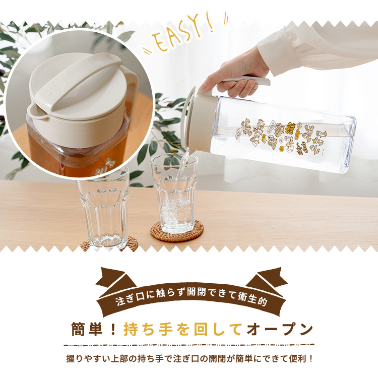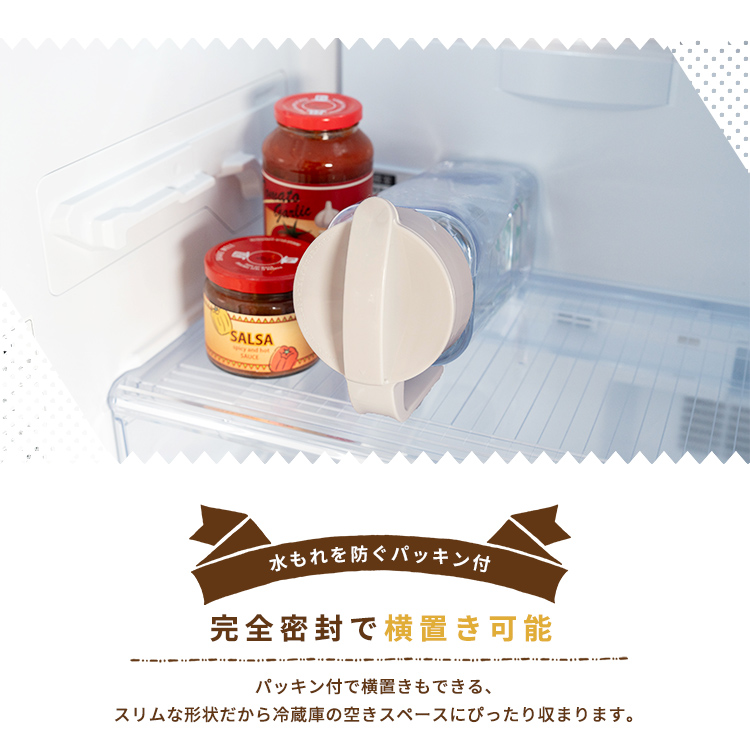 水漏れを防ぐパッキン付き。完全密閉で寝かしても漏れないから、冷蔵庫でも横置きできます。また耐熱仕様で、麦茶などの煮出しも可能。中まで手を入れられる広口設計の冷水筒です。