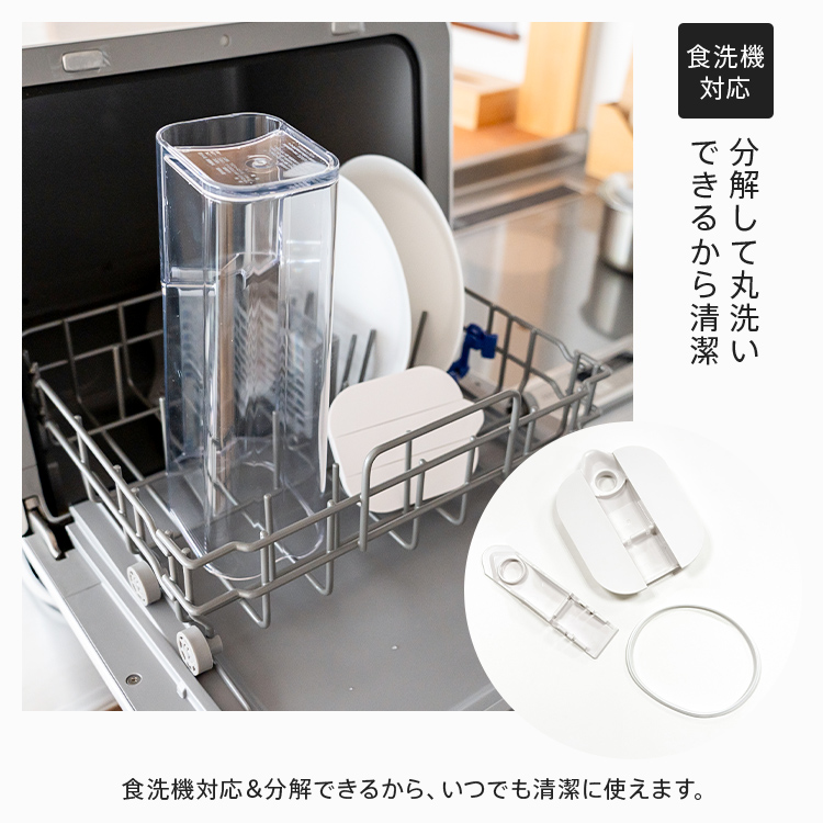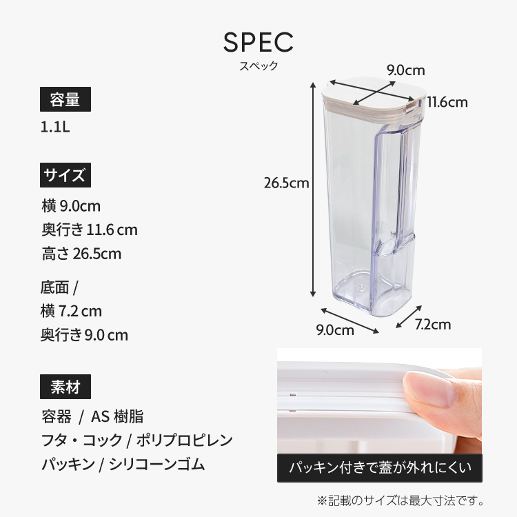 - 本体=AS樹脂、フタ・栓=ポリプロピレン、フタパッキン=シリコーンゴム