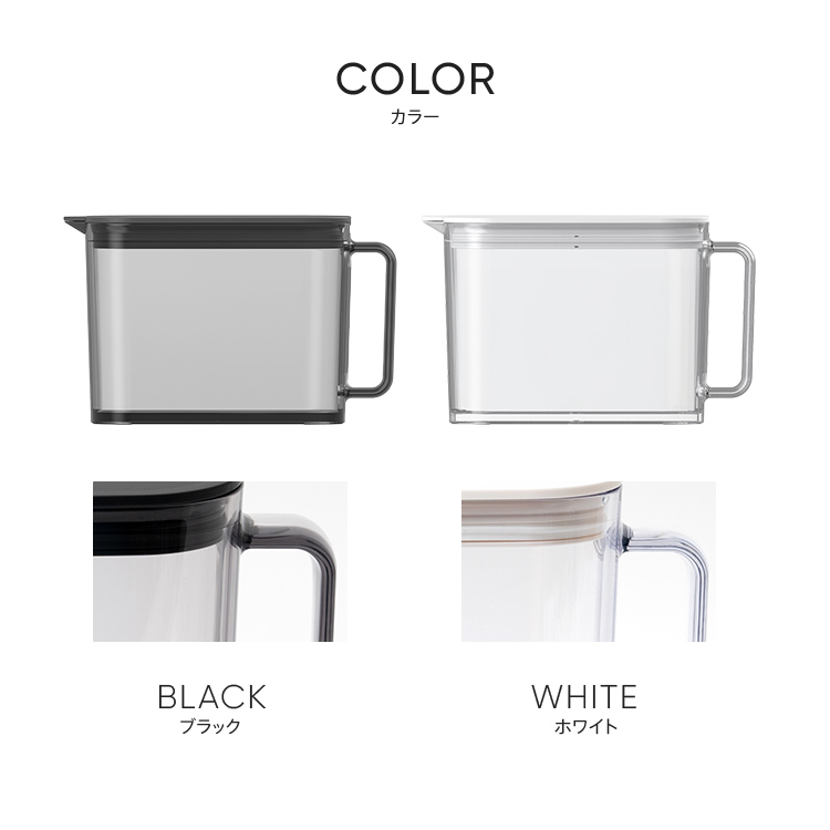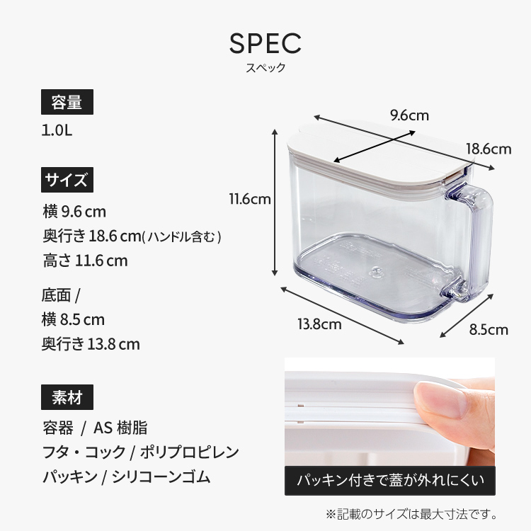 - 本体=AS樹脂、フタ・栓=ポリプロピレン、フタパッキン=シリコーンゴム